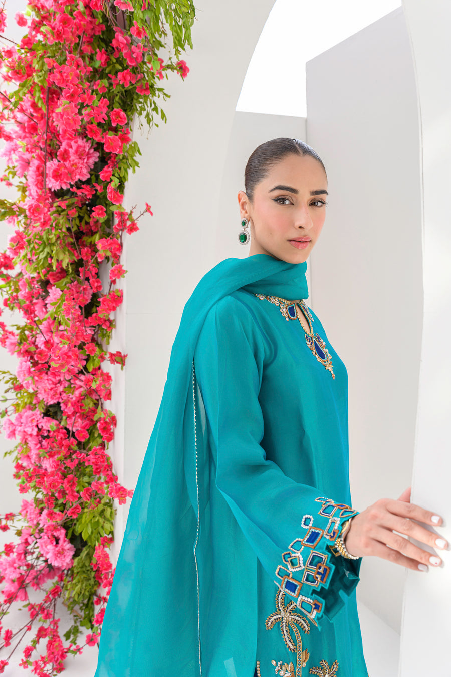 A refined take on our bestseller Blue Lagoon, this three-piece ensemble features an Aqua Ocean shirt and dupatta paired with an Ocean Blue shalwar. Handcrafted with dabka, kora, and resham in contrasting blue tones, the design showcases scenic motifs including palm trees and camel-inspired details. Made from luxurious pure sheesha silk with a pure sheesha organza dupatta, it's a statement of elegance and artistry.