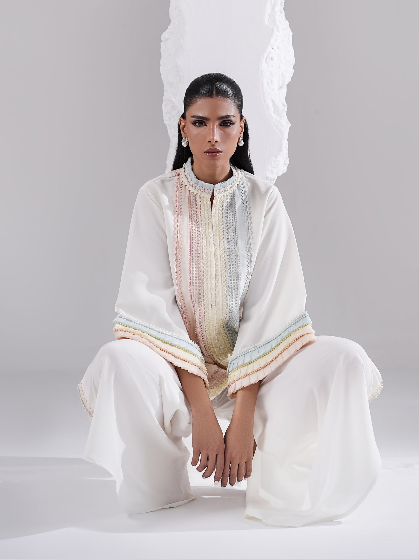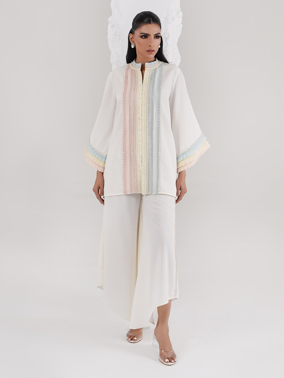 • Pure organza pastel color pleats on sleeves paired with pearl laces