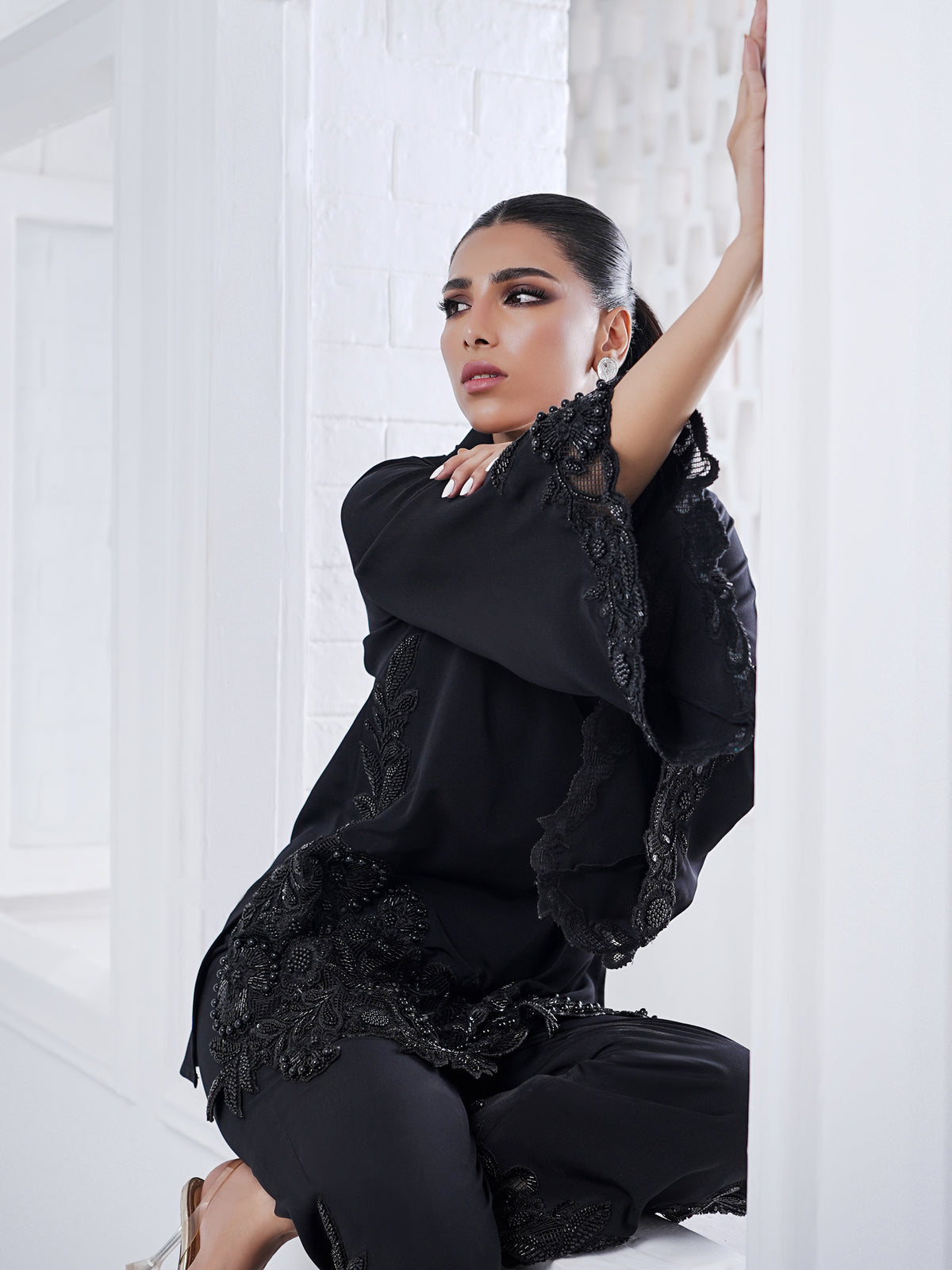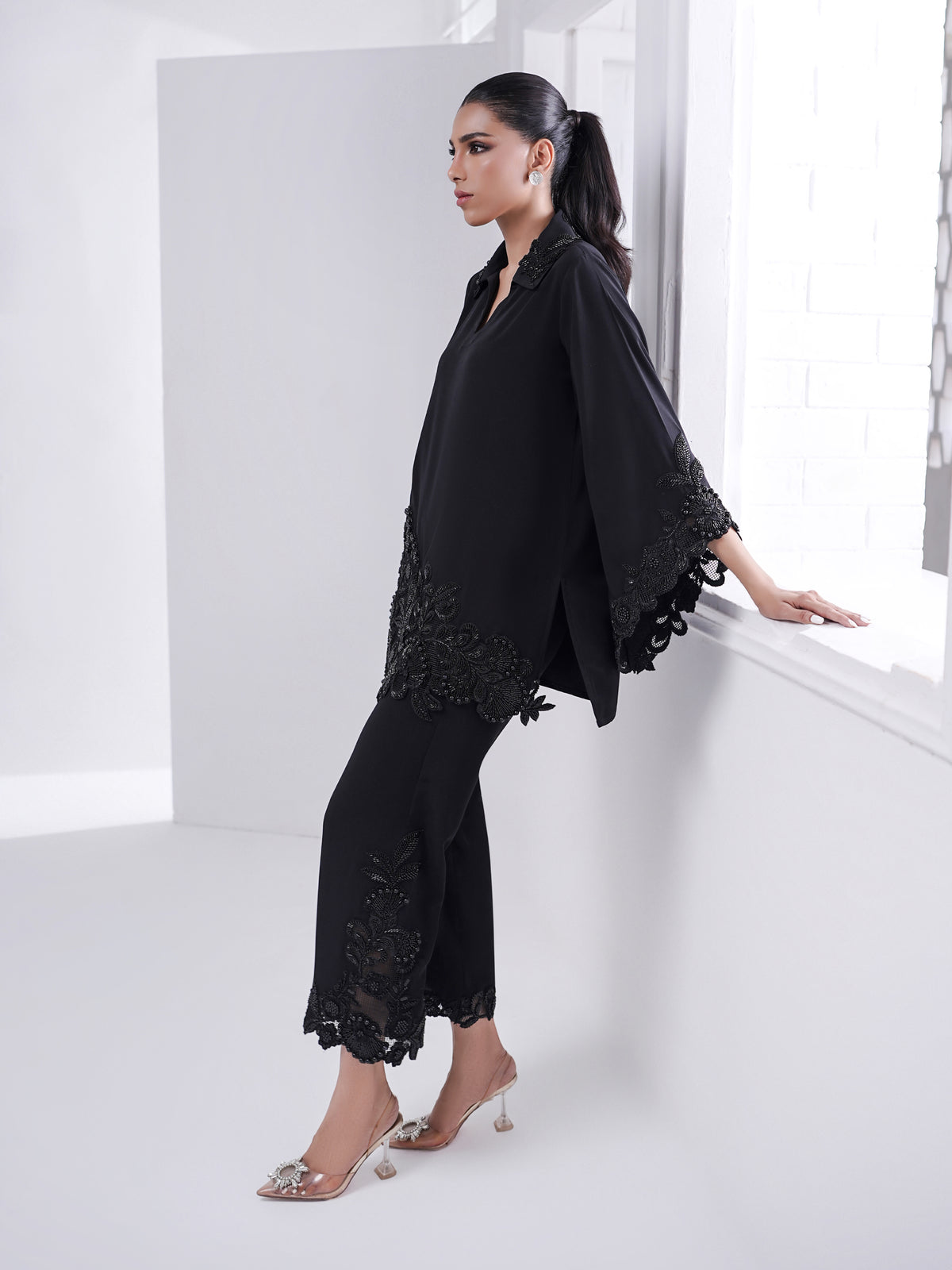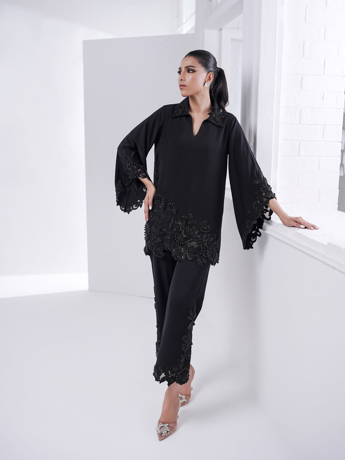 • Fully beaded elaborate cut work appliqué on shirt, sleeves and culottes