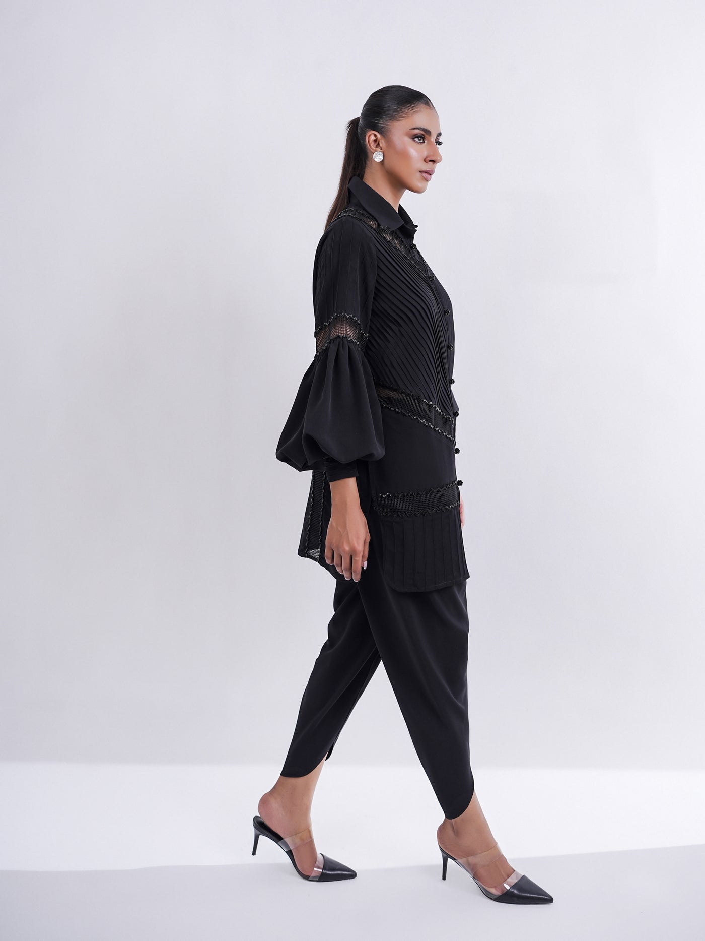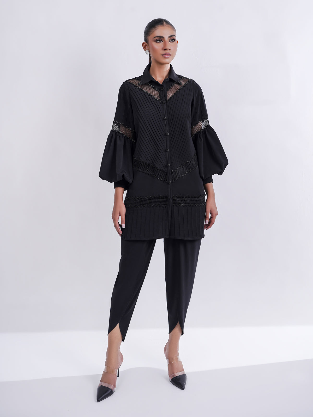 • Pleated shirt with beaded lace appliqué on net trims all over