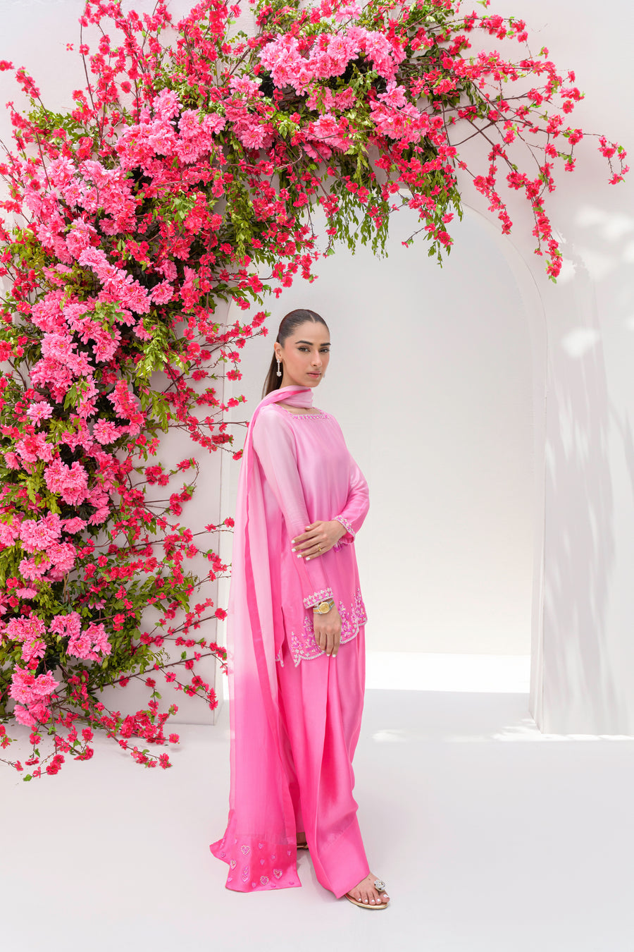 CandyFloss is a dreamy two-toned ombré ensemble in soft candy pink hues. The short shirt and farshi shalwar are tailored from pure sheesha silk, paired with a flowing sheesha organza dupatta. Delicate sequin and stone work in cool pink shades adorn the neckline and daman, while shimmering sequin hearts grace the edges of the dupatta, adding a whimsical touch.