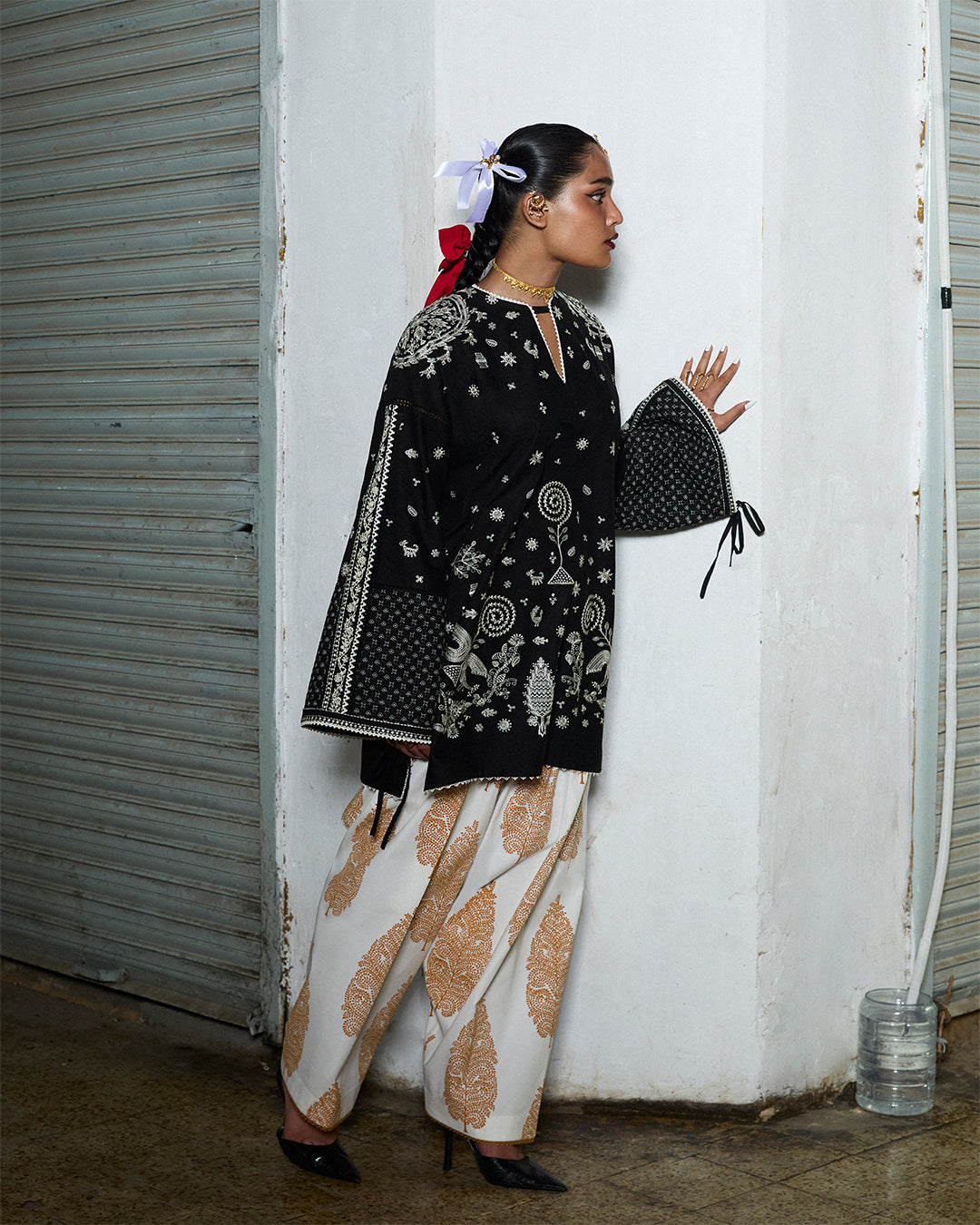 Description: Effortless drama in black and ivory — this short shirt features monochrome embroidery with bell sleeves cinched by drawstrings. Paired with a screen-printed ivory shalwar, it’s a blend of modern structure and traditional artistry.