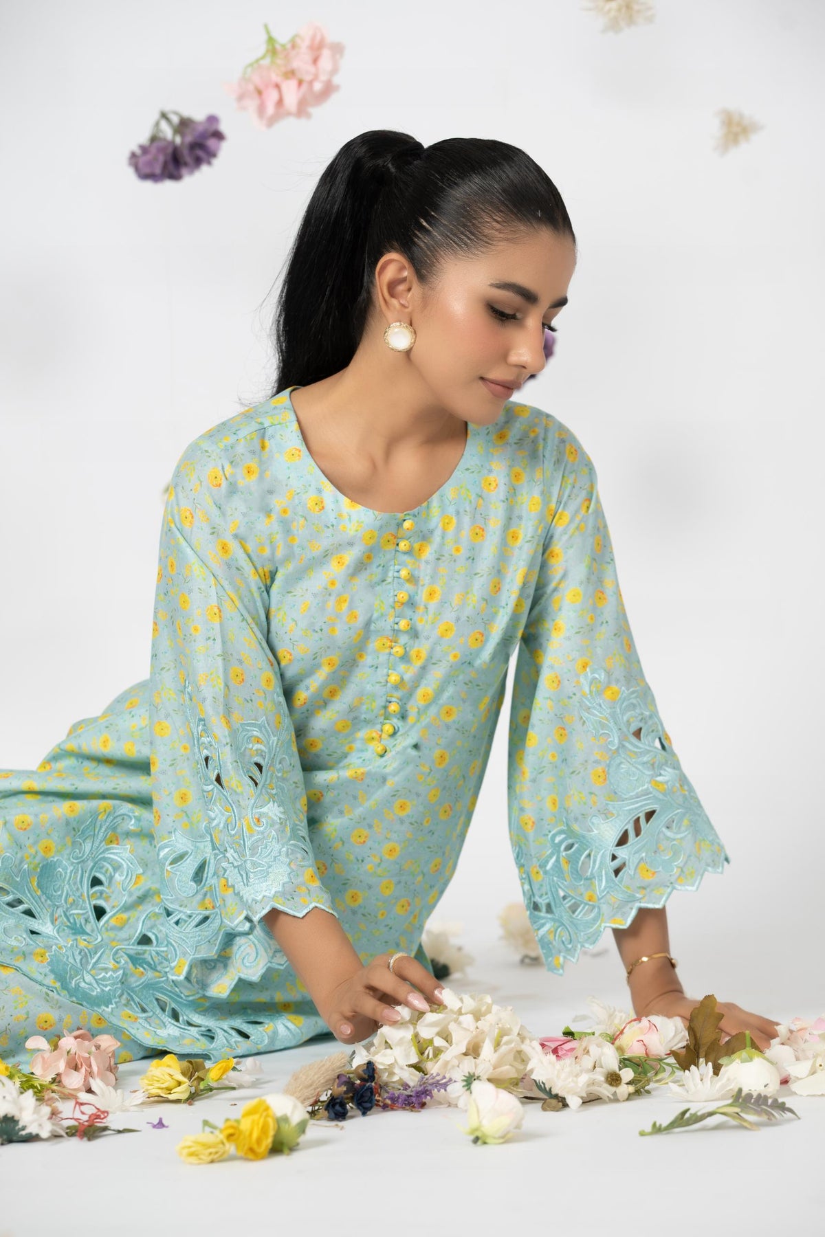 A coordinated printed set adorned with refined cutwork embroidery at the sleeve edges, shirt hemline, and culotte hems—bringing subtle elegance to everyday wear.