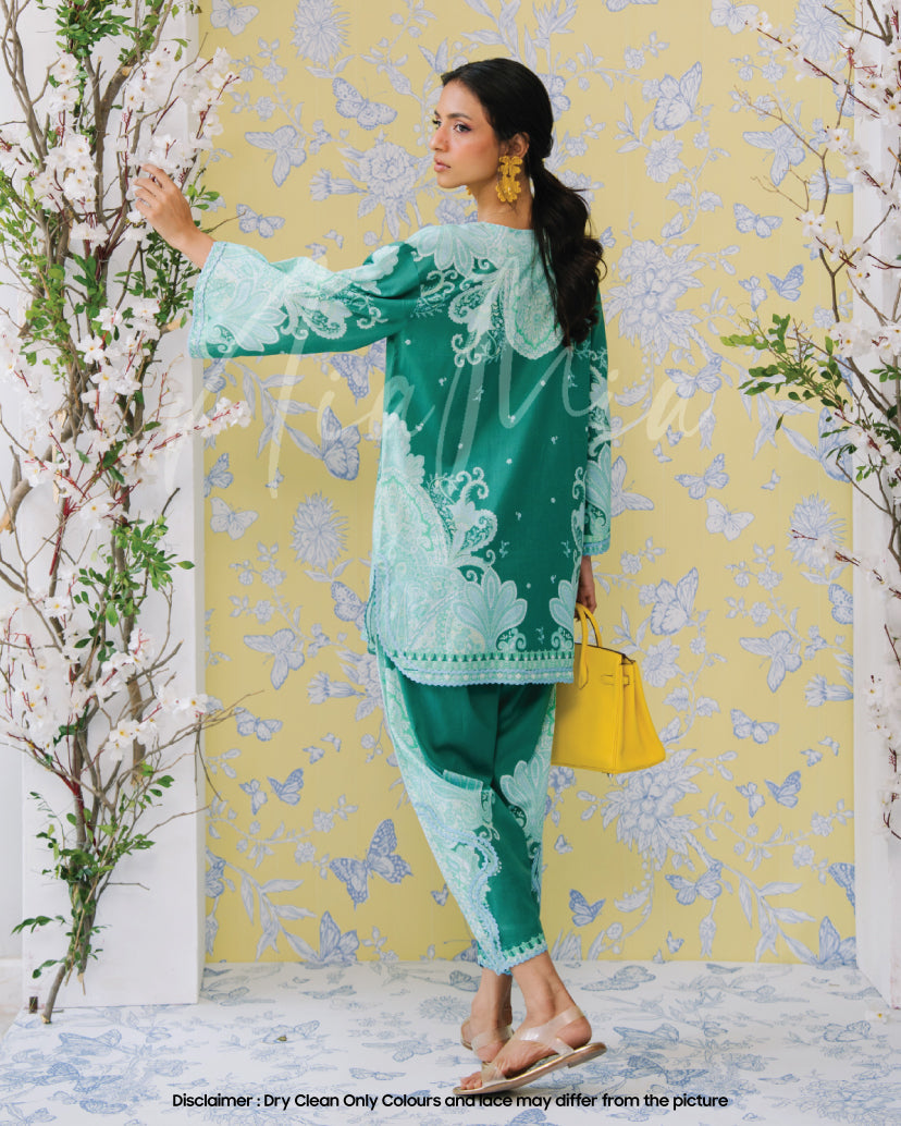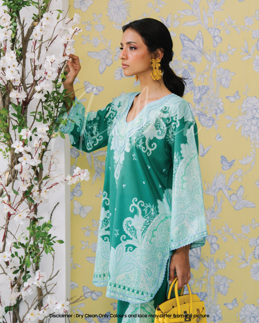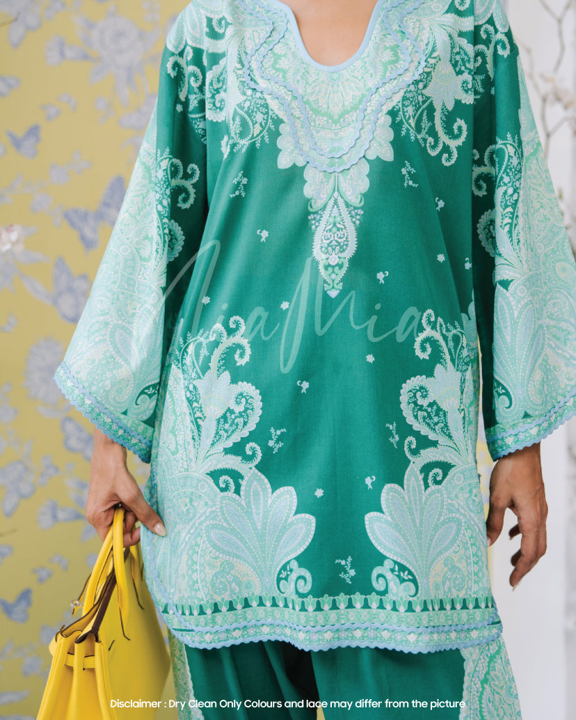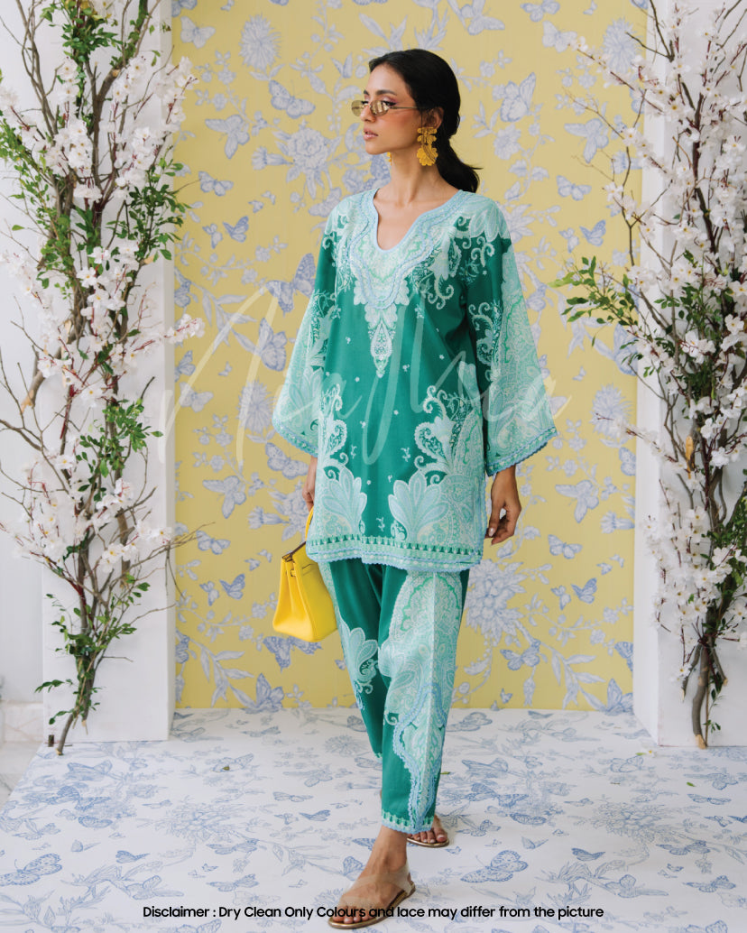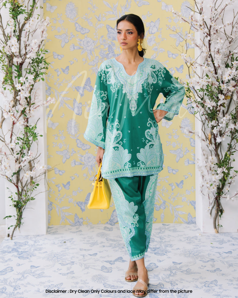 Graceful and grounded, this article is a celebration of serene elegance. This rich emerald green ensemble features a relaxed silhouette adorned with intricate white print.