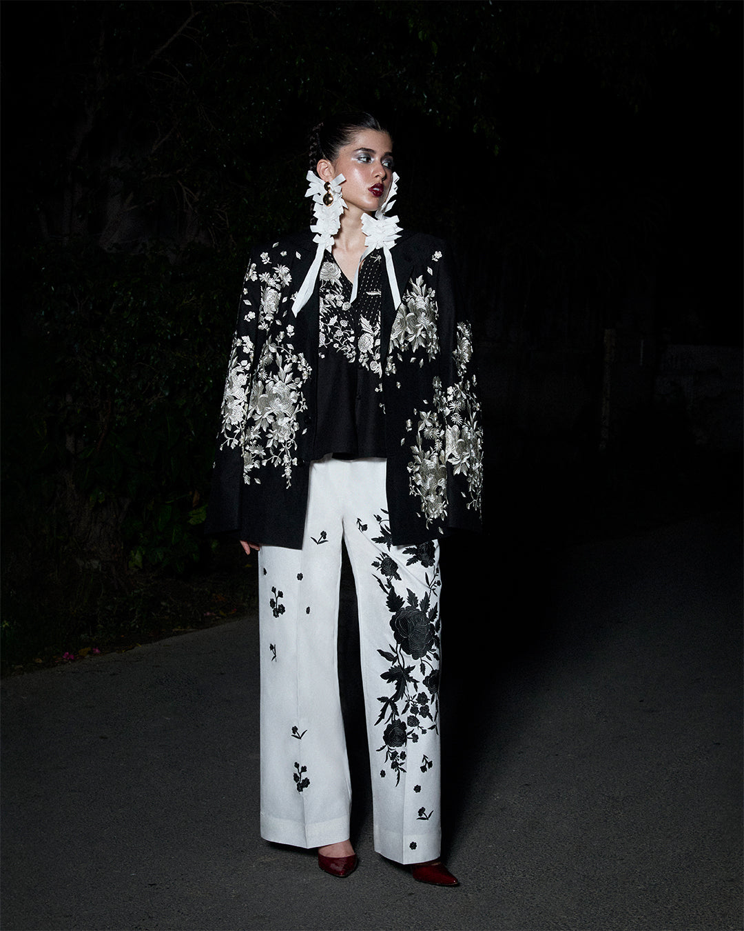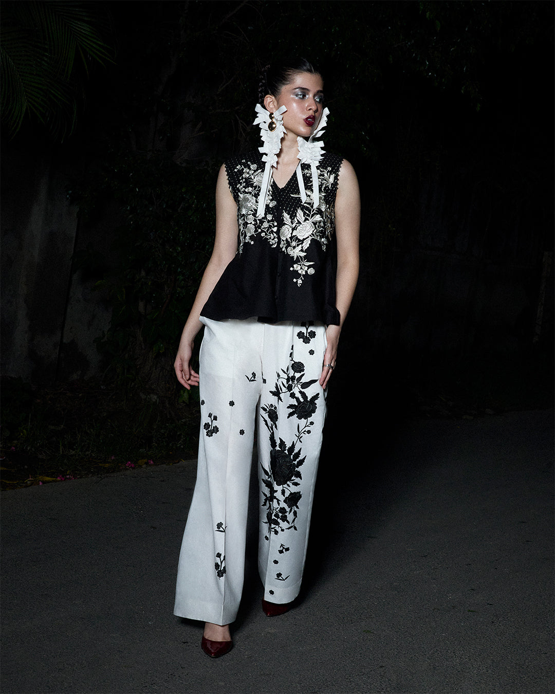 Description: Bold contrast comes alive in this sleeveless black short shirt with floral embroidery, paired with ivory pants blooming in matching motifs. A set that speaks in dual tones and unified craft.