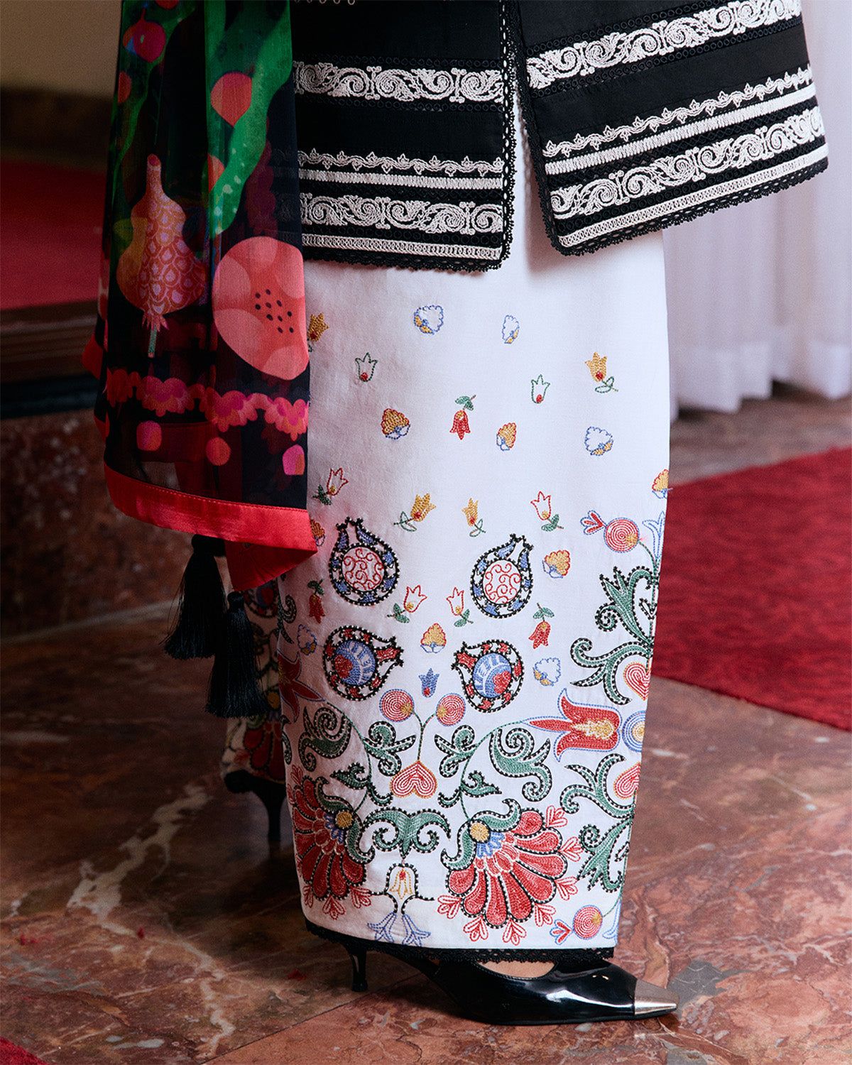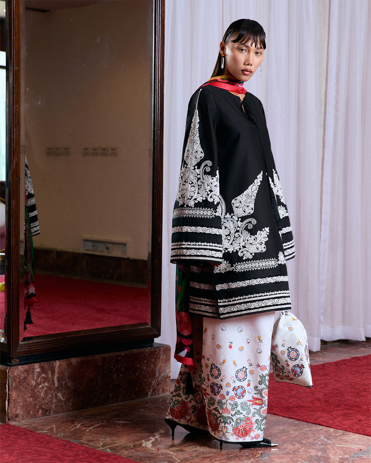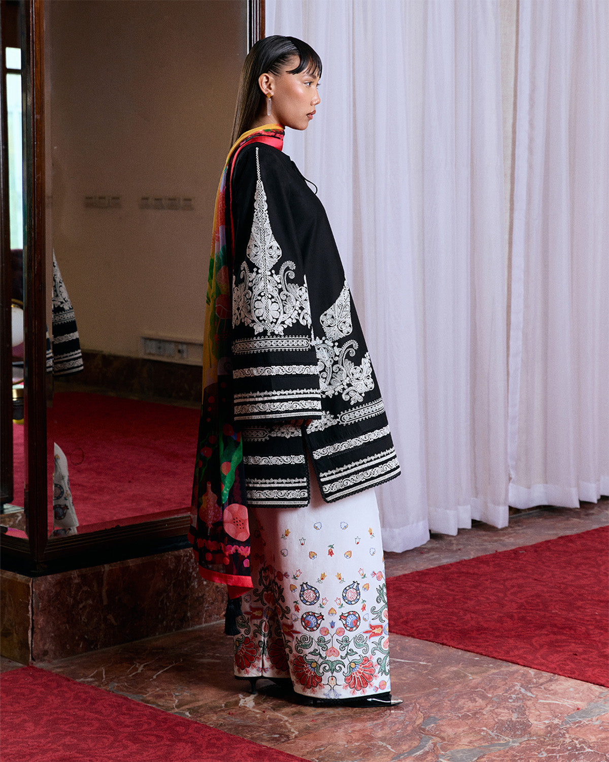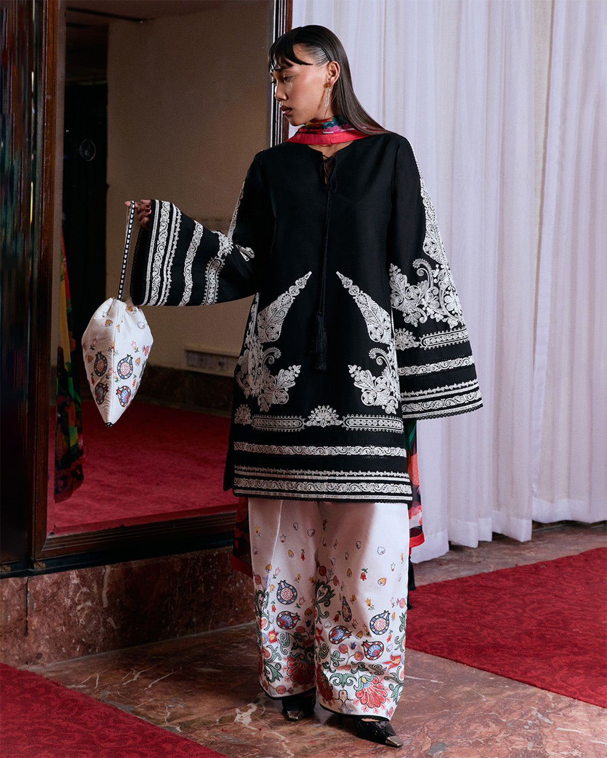 Description: This black shirt is detailed with monochrome dori embroidery and finished with soft tassels for a touch of movement. Bell sleeves echo the same threadwork, while an ivory shalwar featuring multicolor traditional embroidery introduces contrast and craft. A digitally printed chiffon dupatta completes the look with grace and lightness.