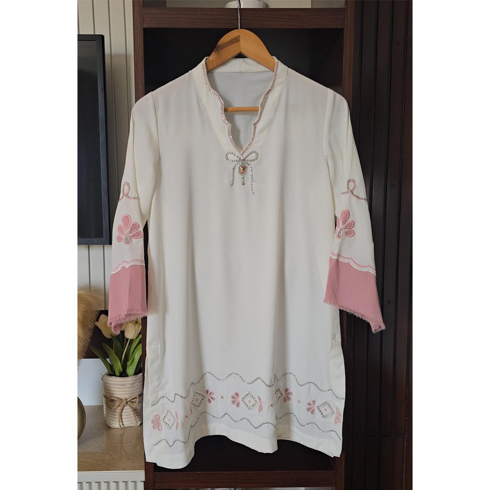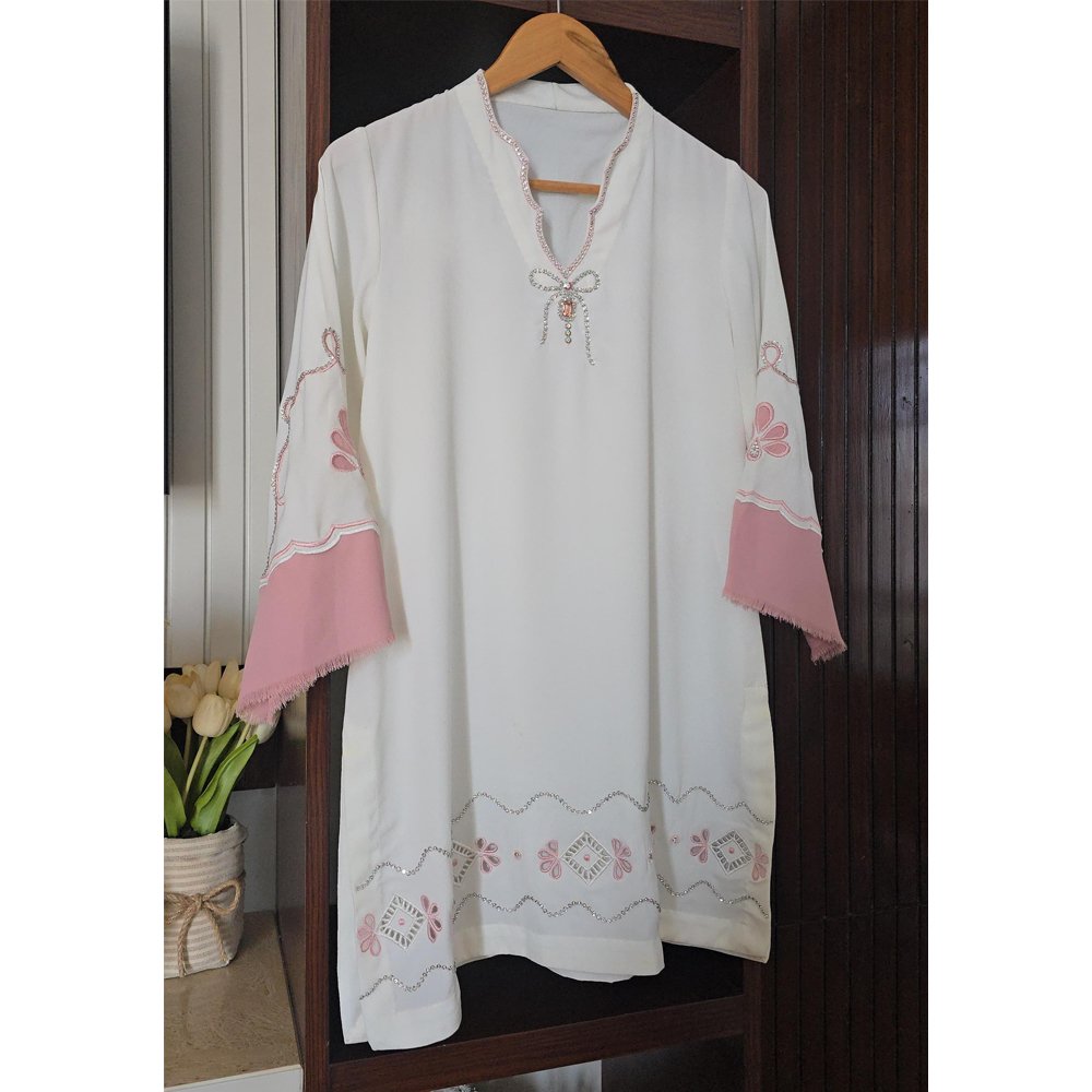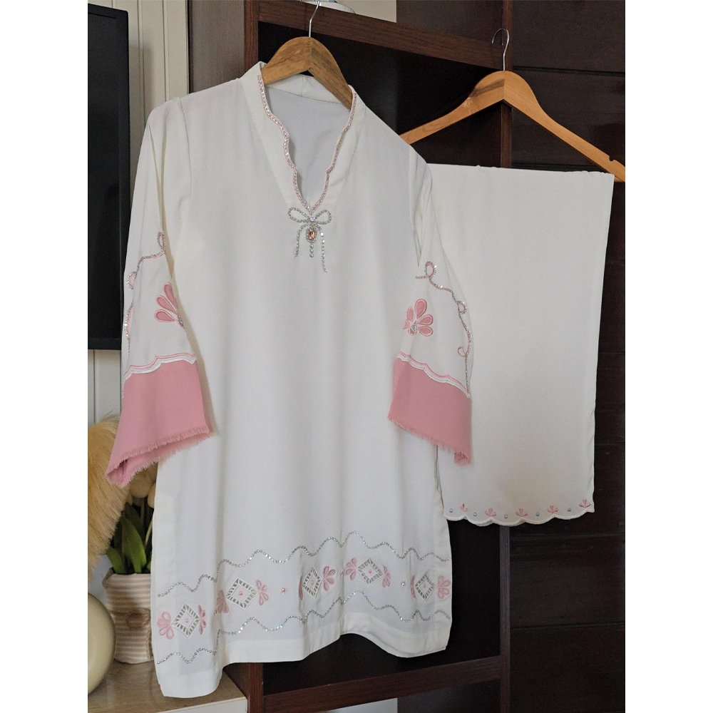 A sophisticated pearl white outfit featuring a smart cut with stunning swarovski neckline and bow detail. Intricate swarovski work spirals and intricate cutwork motifs on daman.