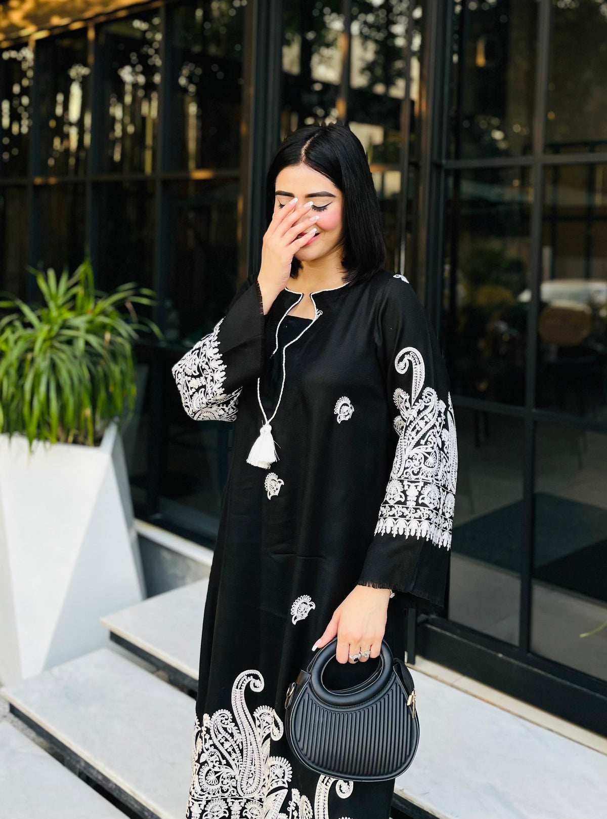 Crafted with elegance, this black pashmina shawl kaftan exudes timeless charm. The delicate white embroidery along the daman and sleeves adds a touch of sophistication, making it the perfect blend of tradition and contemporary style. Ideal for evening gatherings or special occasions, this piece offers a graceful silhouette and a luxurious feel.