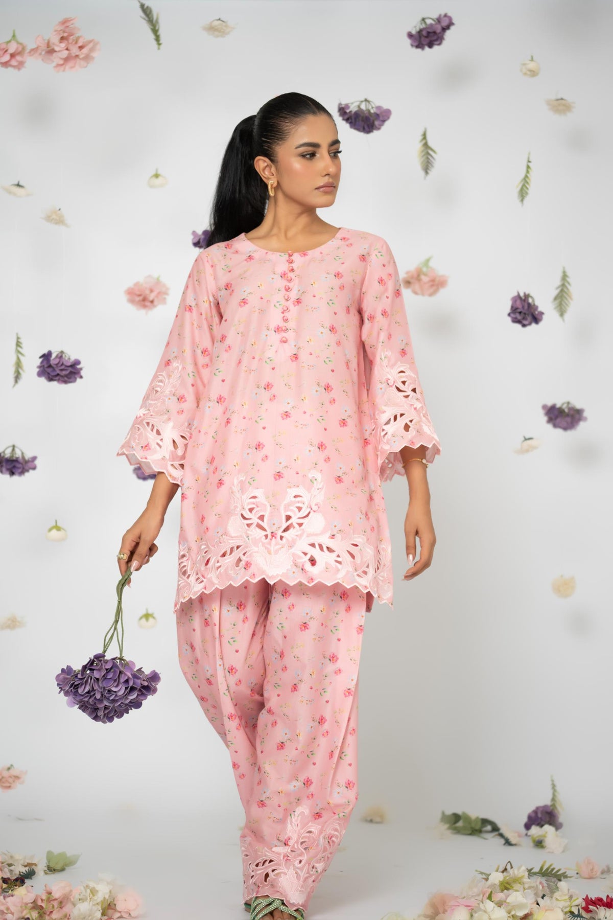 A coordinated pure lawn printed set adorned with refined cutwork embroidery at the sleeve edges, shirt hemline, and shalwar hems—bringing subtle elegance to everyday wear.