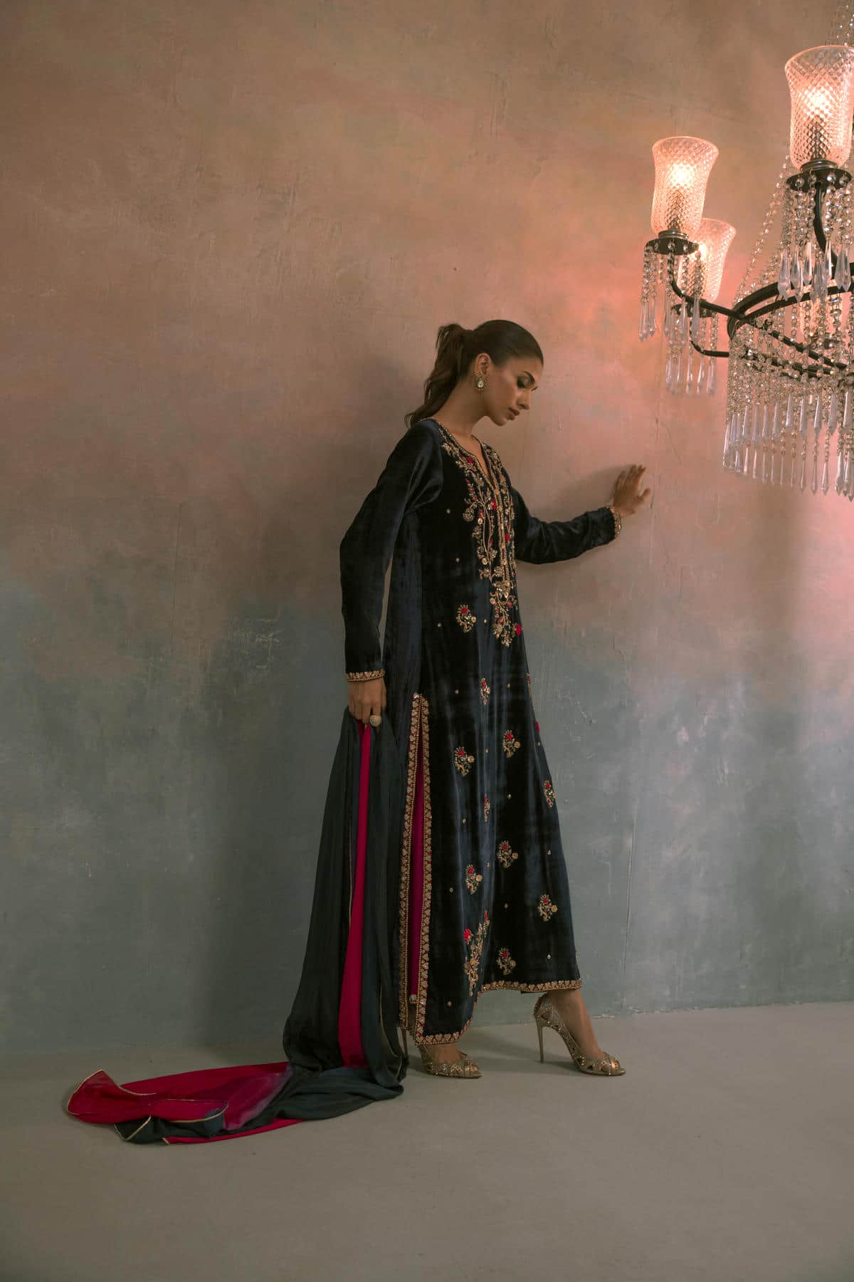 Deep midnight blue velvet handworked in bronze gold dabka and zardozi with Fuschia resham and gota accents. Comes with fuchsia butter silk culottes embroidered in gota and resham. Paired with an ombre shaded silk dupatta it adds a rich festive charm to this classic ensemble.