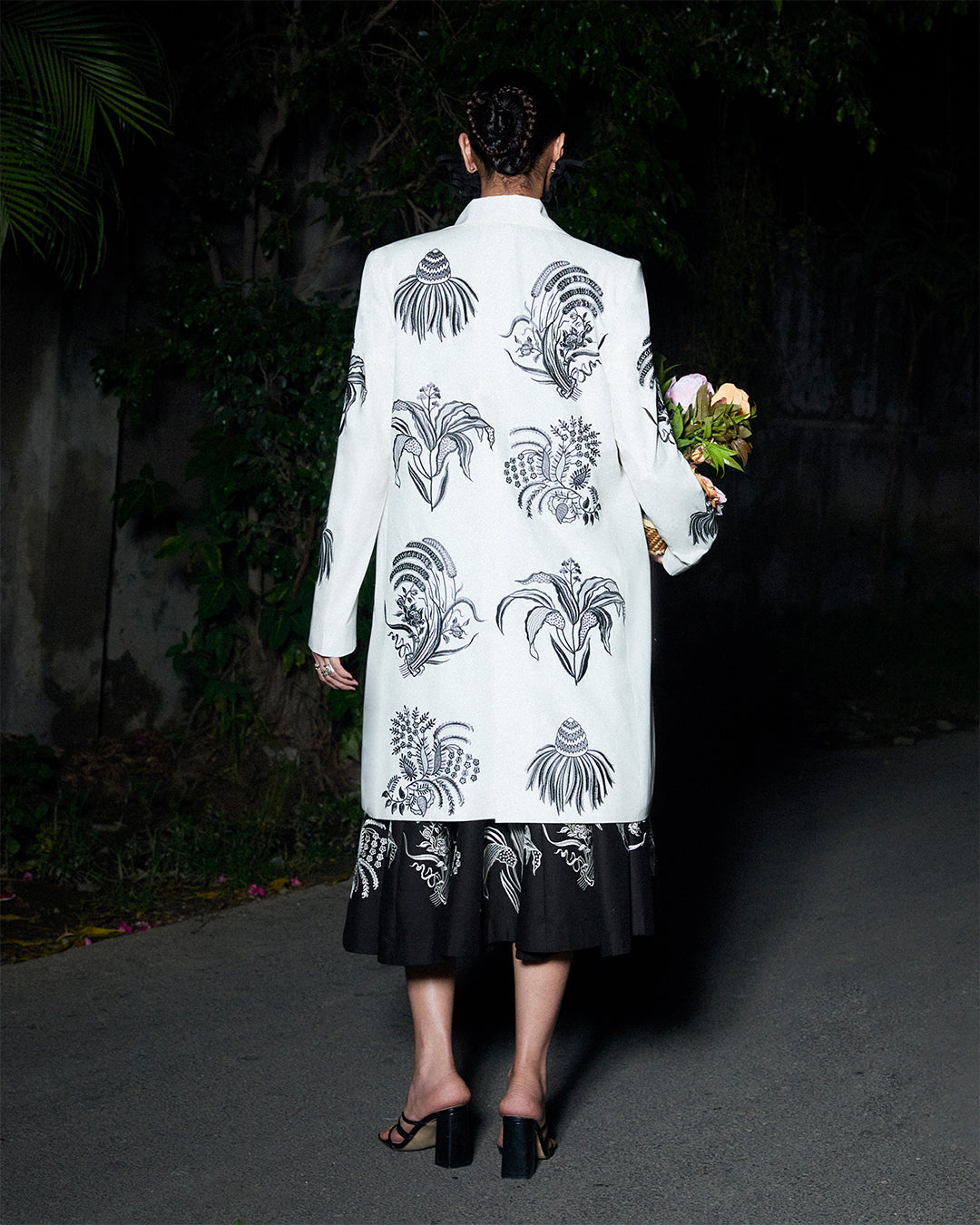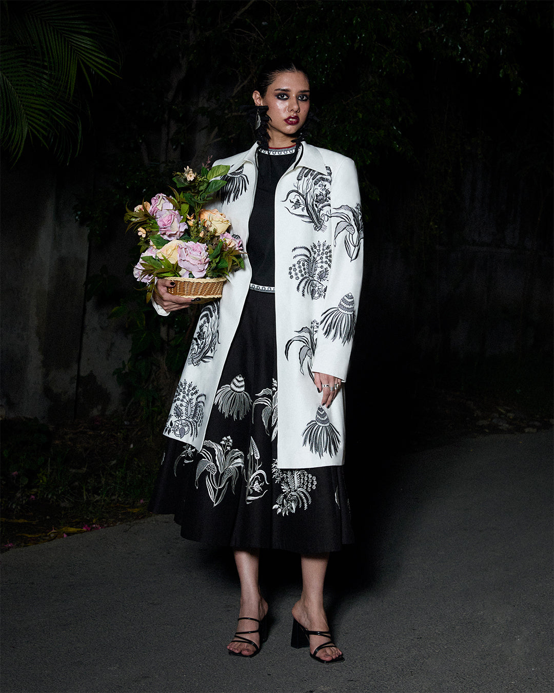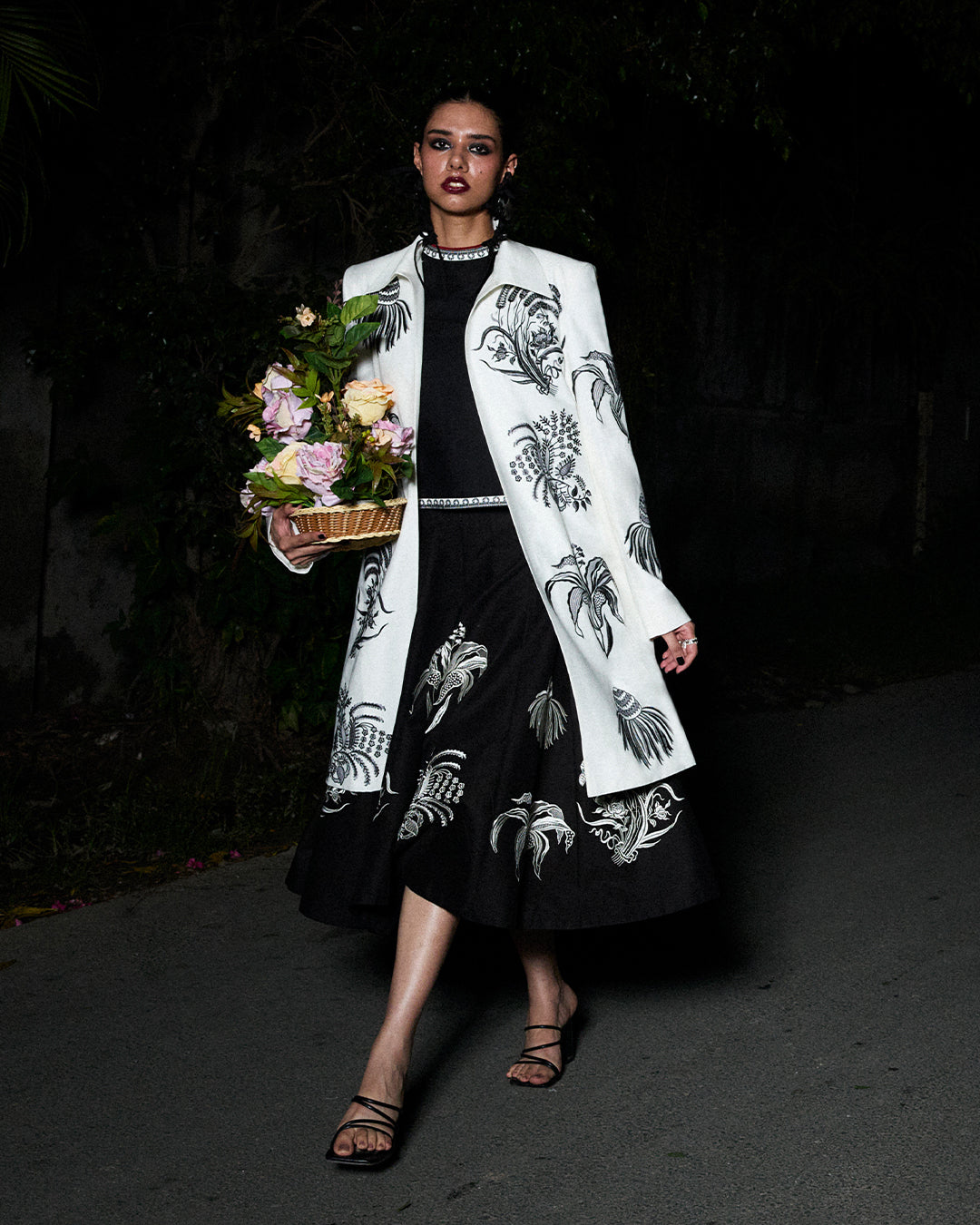 Description: Sharp yet feminine, this sleeveless black top is detailed with tonal embroidery and paired with a monochrome embroidered skirt, offering structure with a touch of softness.