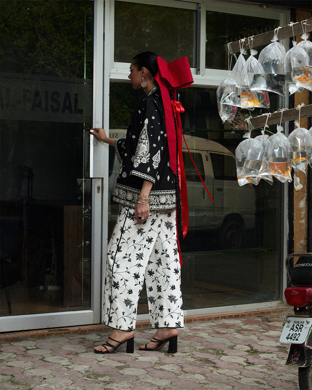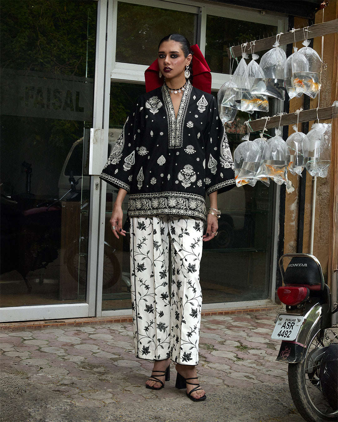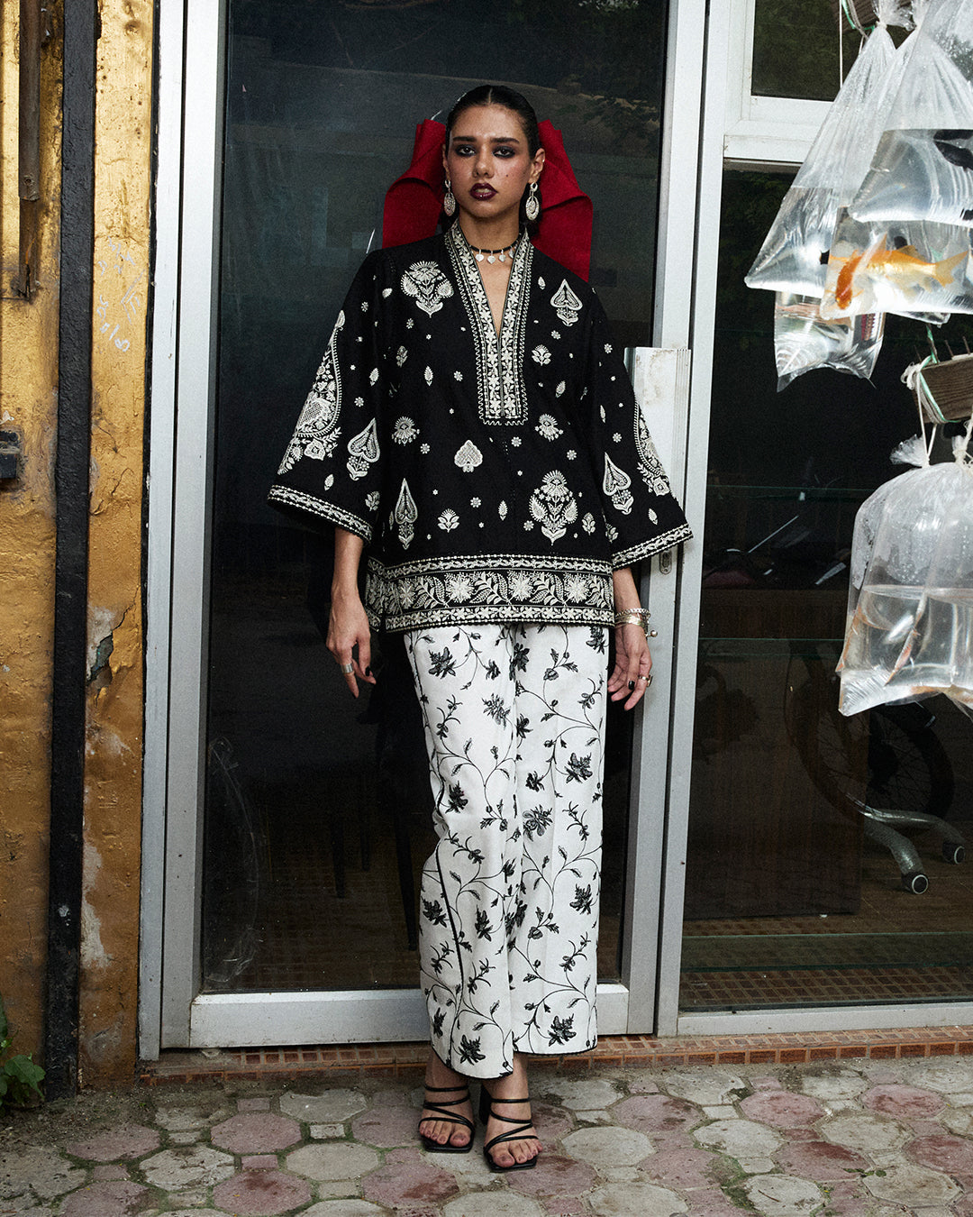 Description: Tradition meets modern form in this black short shirt, adorned with intricate monochrome embroidery. Short sleeves echo the artisanal craft, while ivory pants ground the look with quiet sophistication.