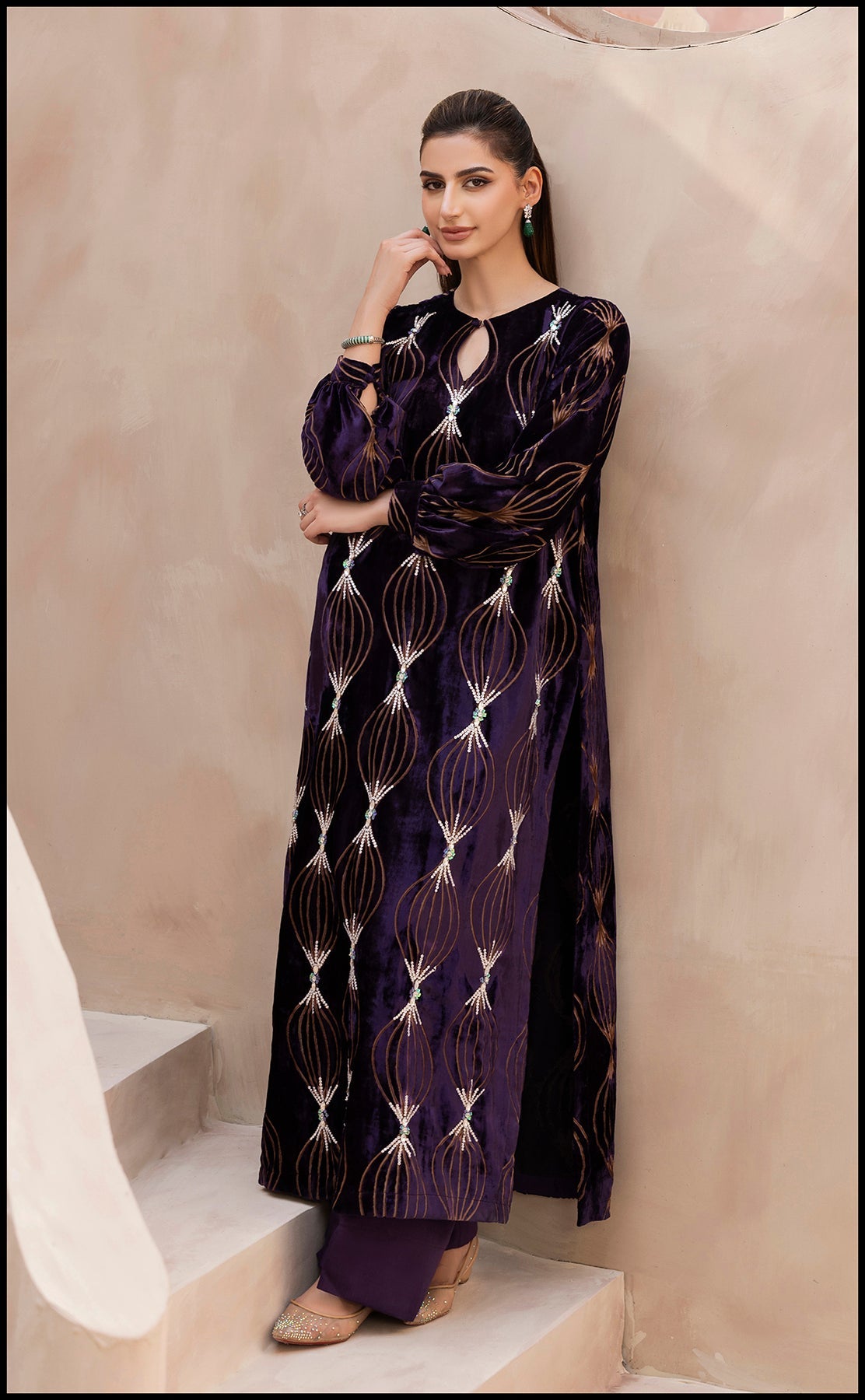 A masterpiece of understated glamour, Plum Jewel is a two-piece velvet ensemble adorned with intricate handwork featuring luminous Swarovski embellishments. The deep plum velvet serves as a rich canvas for the jewel-toned sparkle, creating a captivating play of light and texture. With softly gathered sleeves and an elegant silhouette, this ensemble embodies effortless luxury — perfect for soirées where grace meets grandeur.