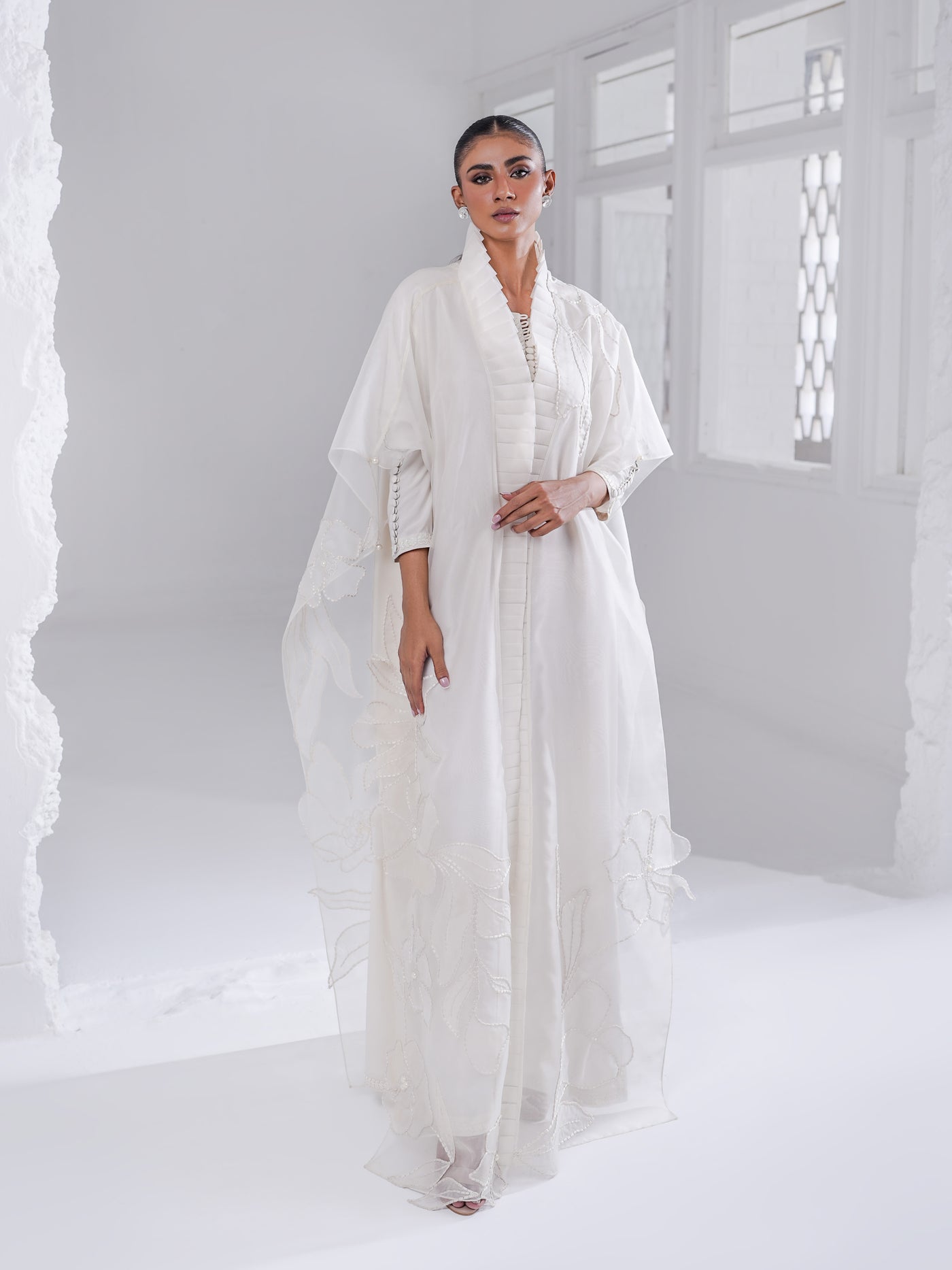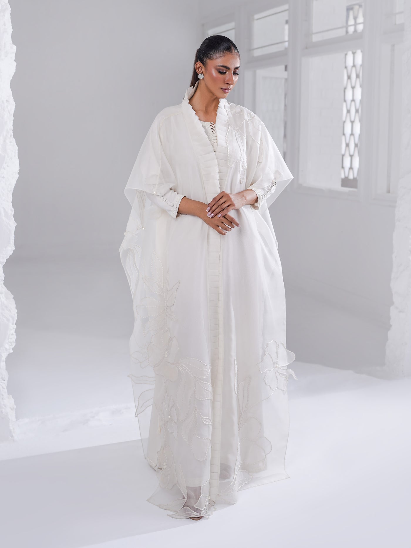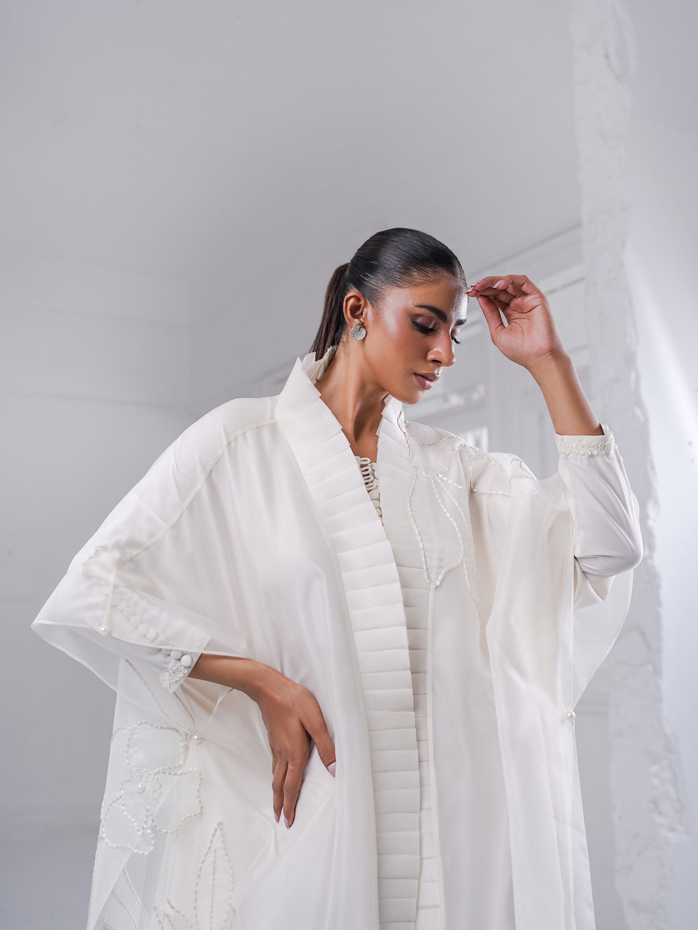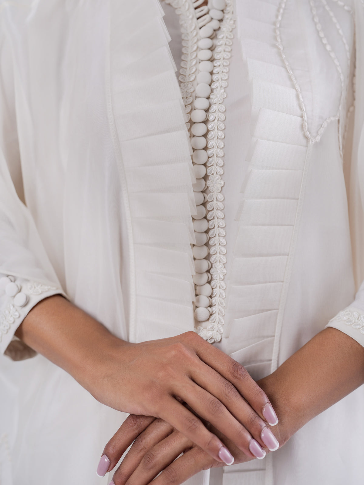 • Ivory inner kaftan finishes with lace, tassels and buttons on sleeves and neckline