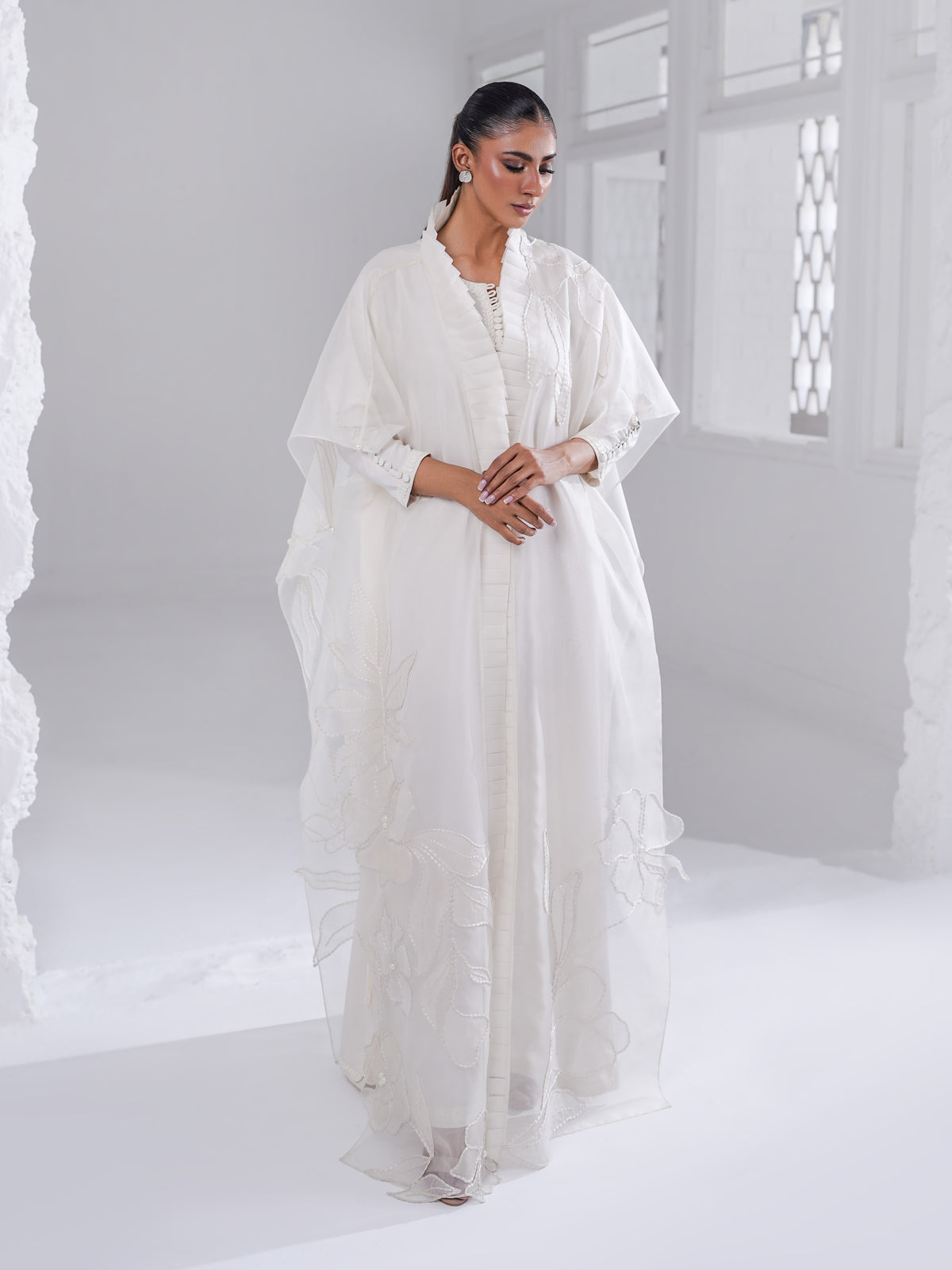 • Cape has elaborate 3d appliqué all over with a pleated neckline and hand-sewn pearls