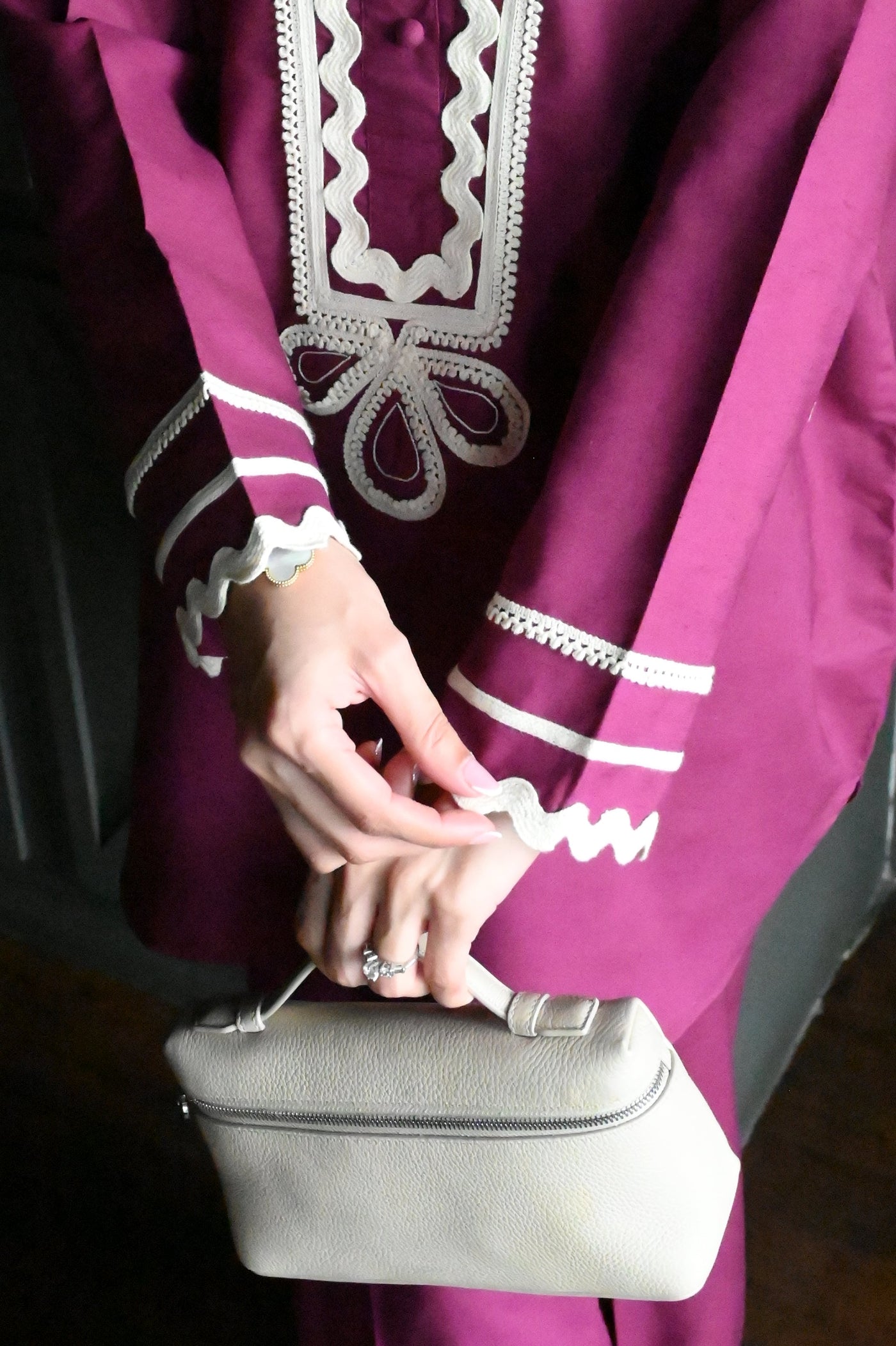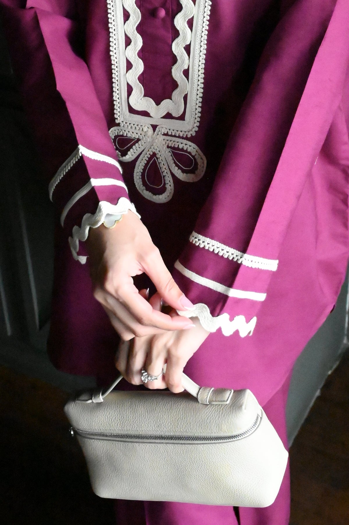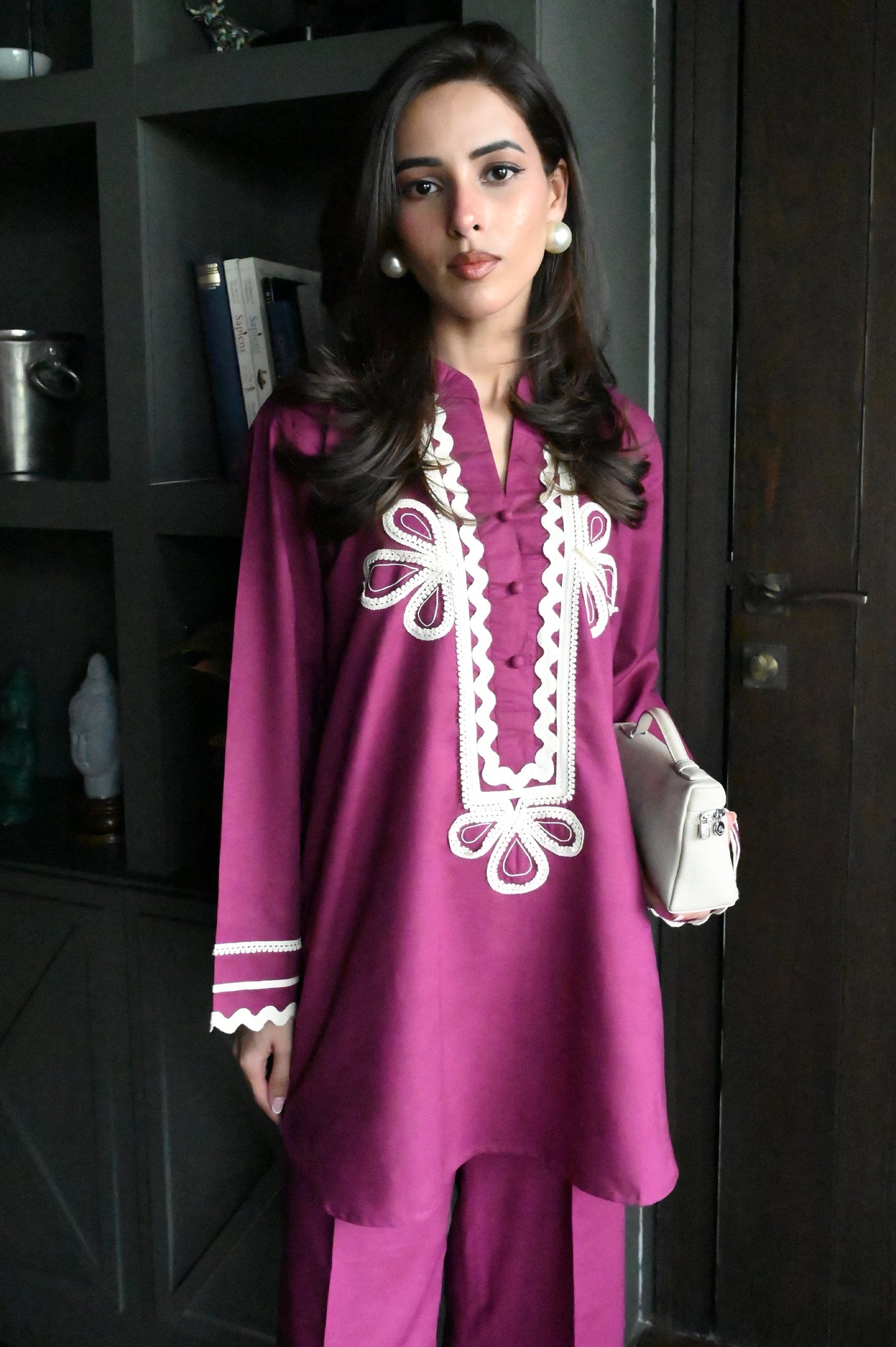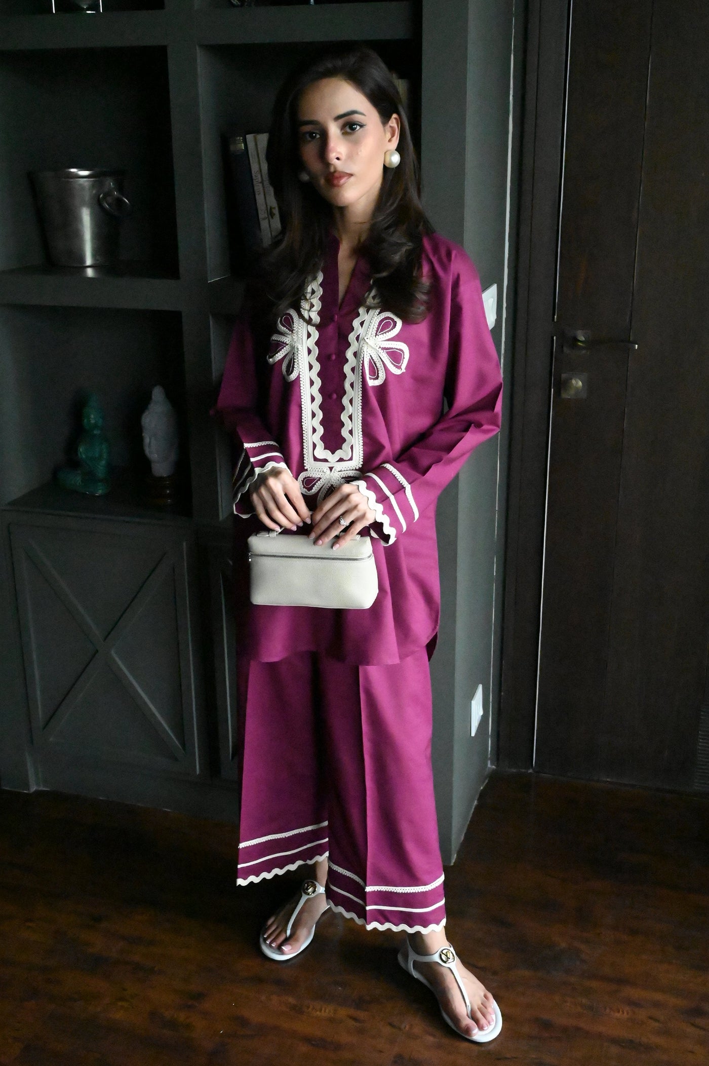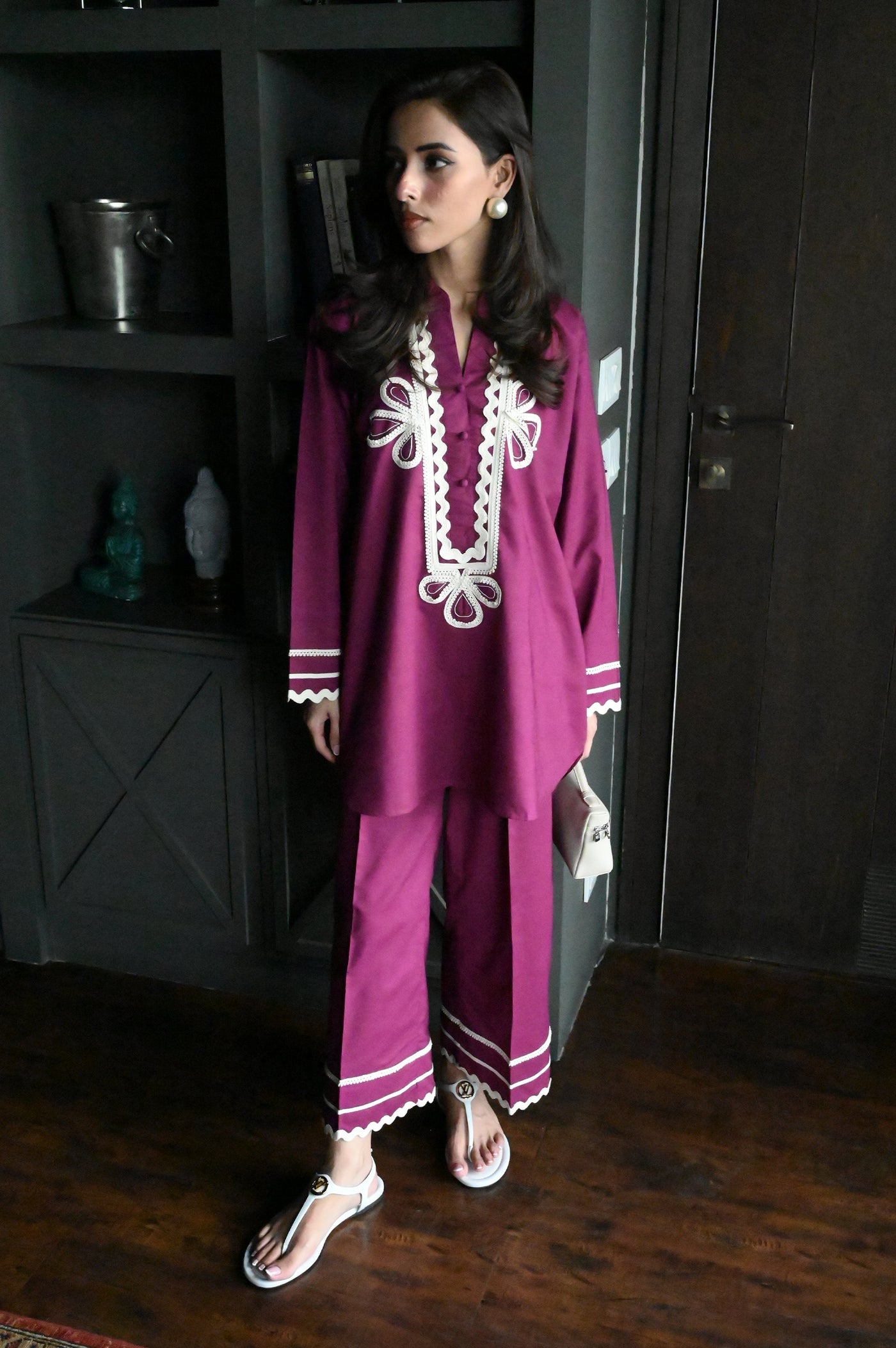 Fuchsia co-ord set featuring cream scalloped detailing and contrast trims on the neckline, sleeves, and hem paired with matching culottes.