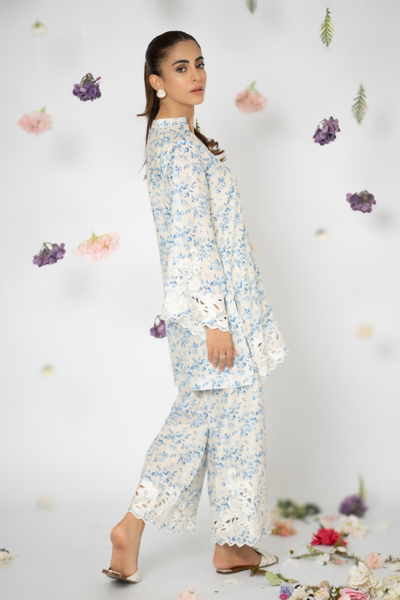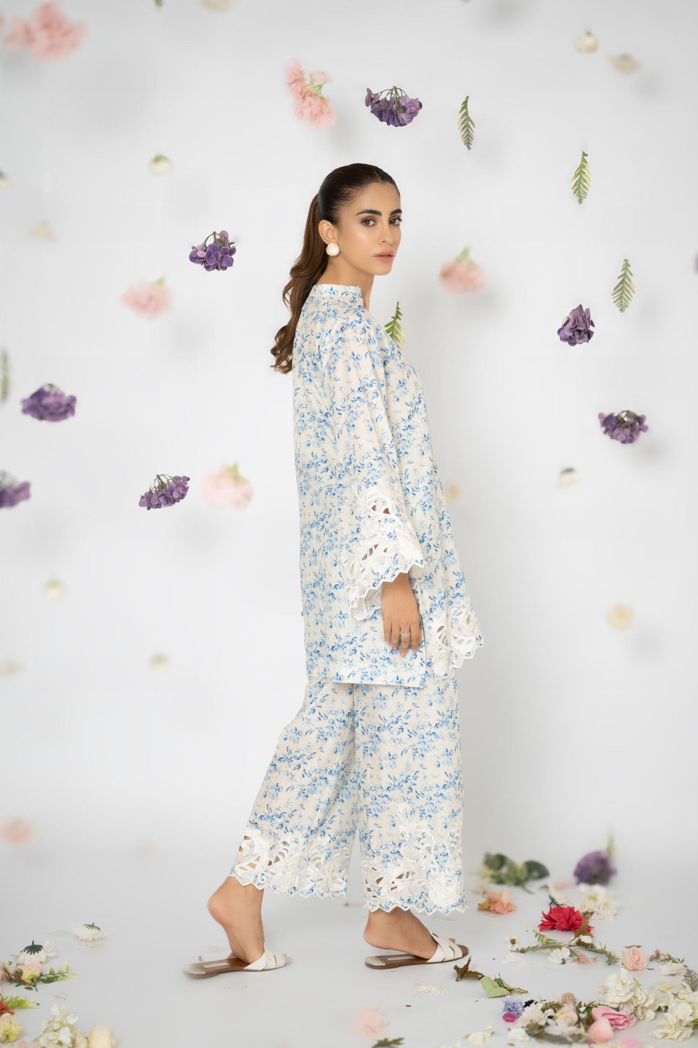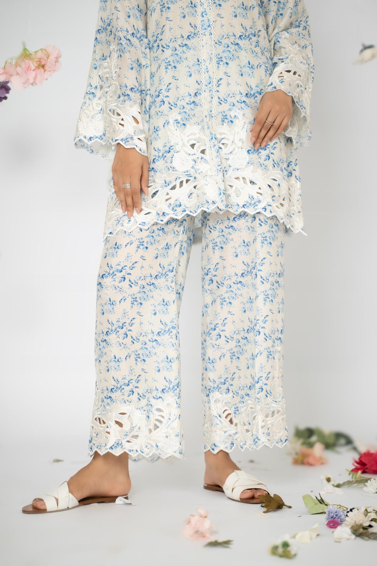 A coordinated printed set adorned with refined cutwork embroidery at the sleeve edges, shirt hemline, and culotte hems—bringing subtle elegance to everyday wear.