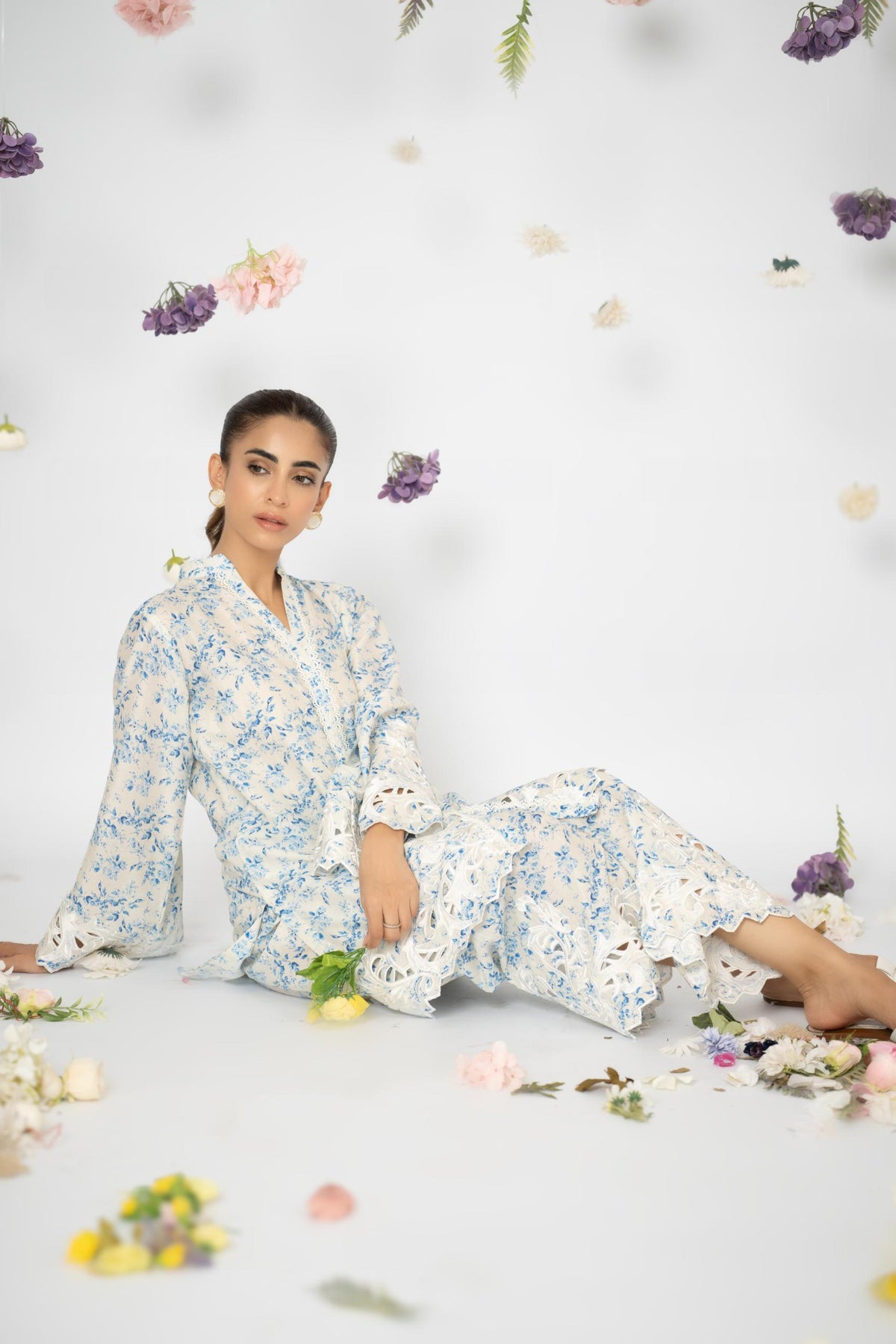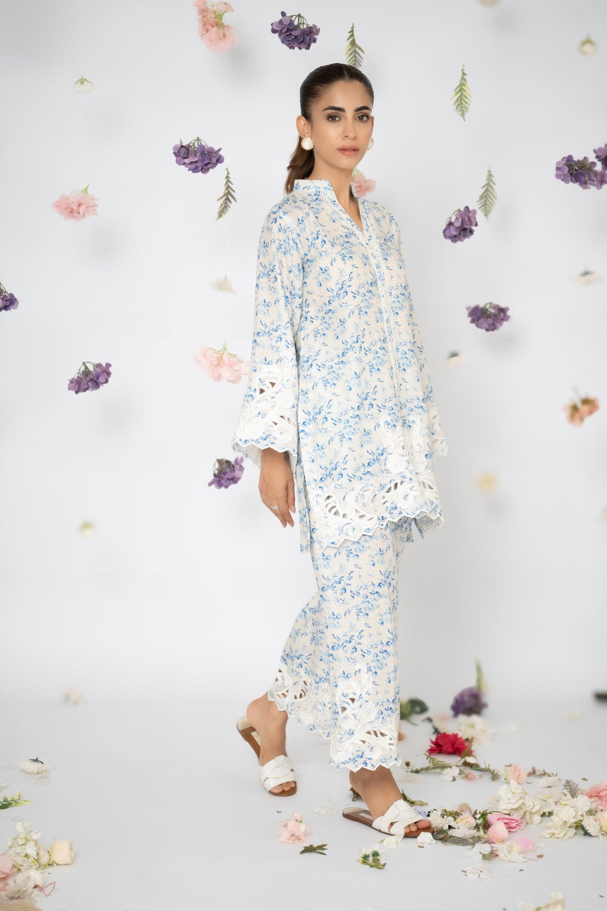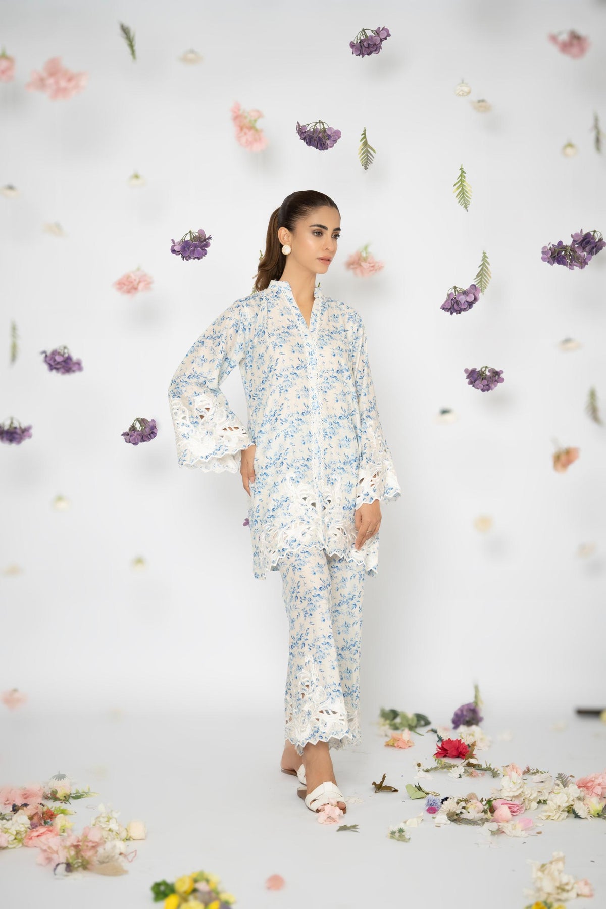 A coordinated printed set adorned with refined cutwork embroidery at the sleeve edges, shirt hemline, and culotte hems—bringing subtle elegance to everyday wear.