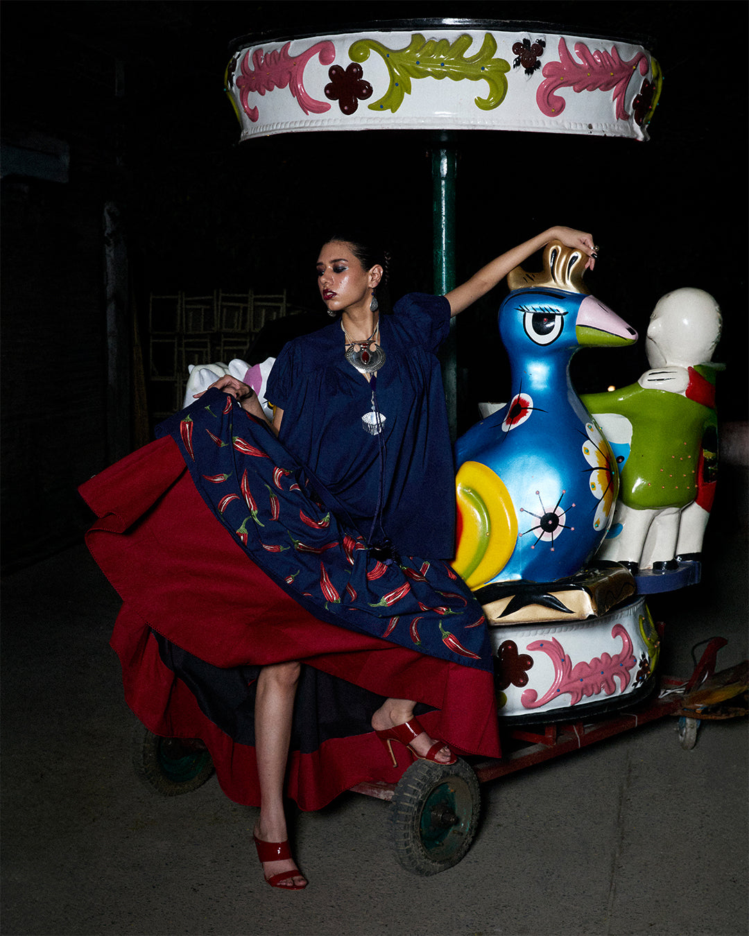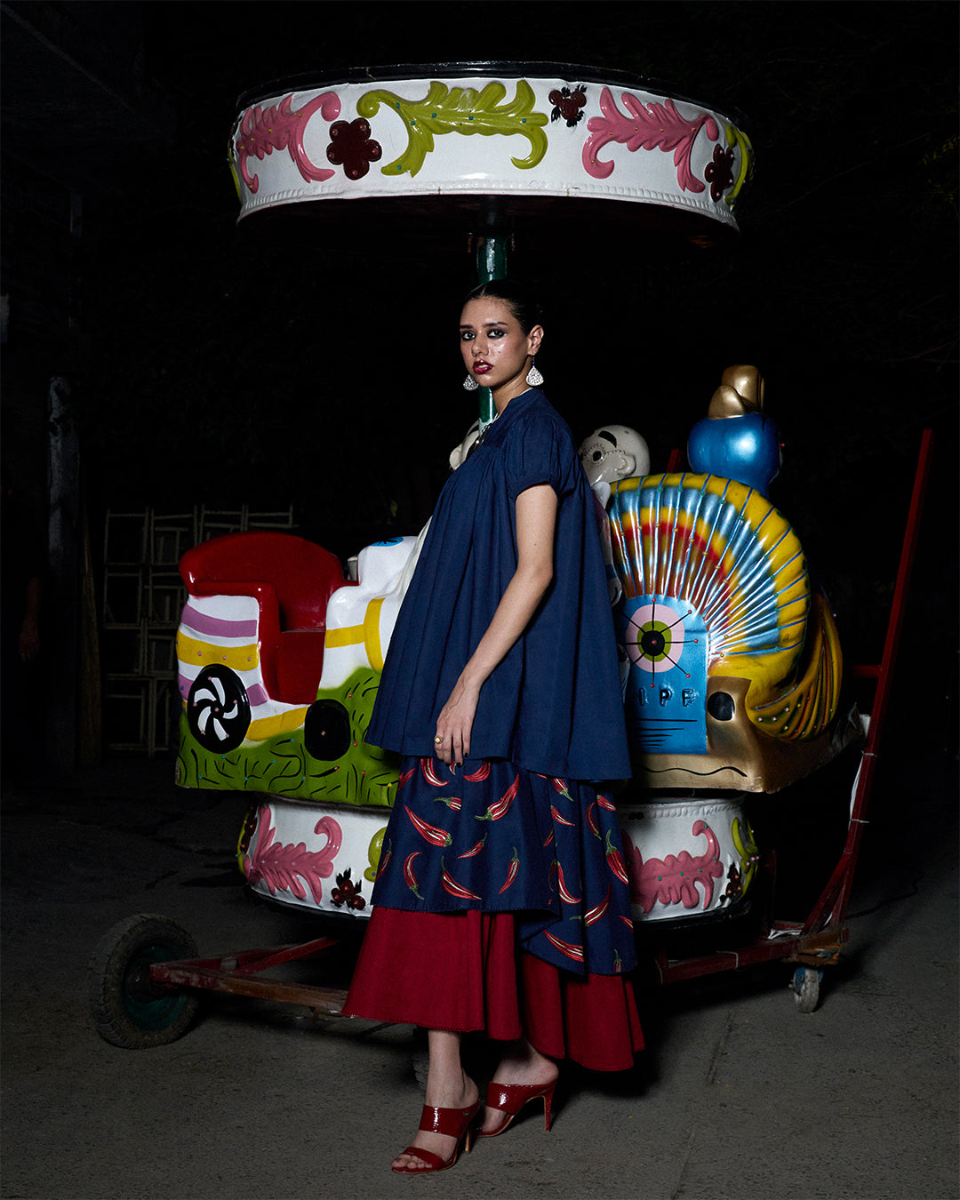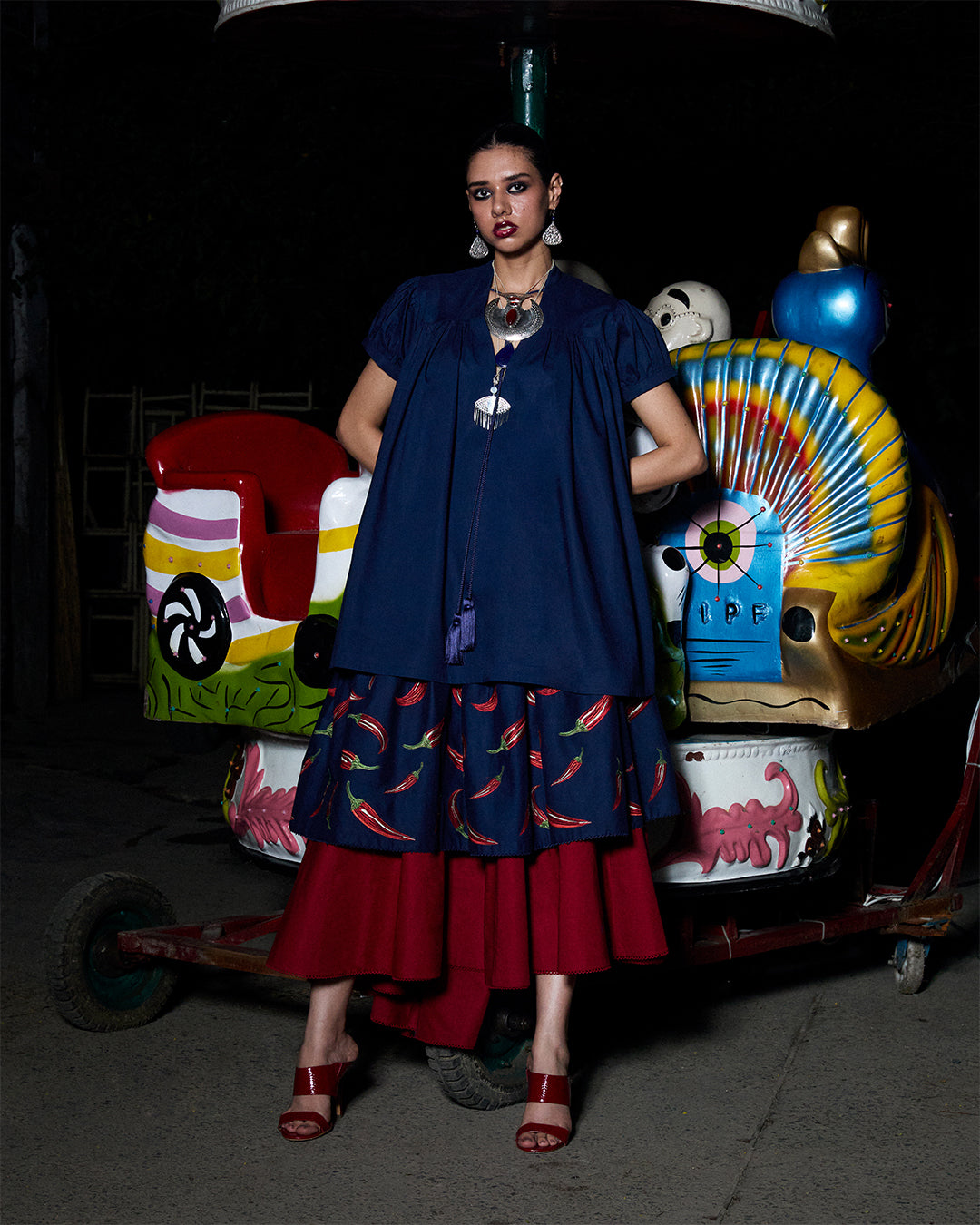 Description: In deep navy tones, this playful short shirt is accented with tassels and paired with a skirt embroidered in vivid red chillies. A hidden red inner layer offers a striking reveal in motion.