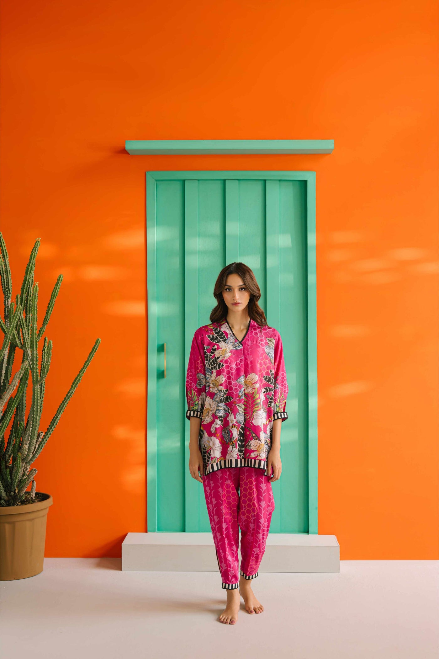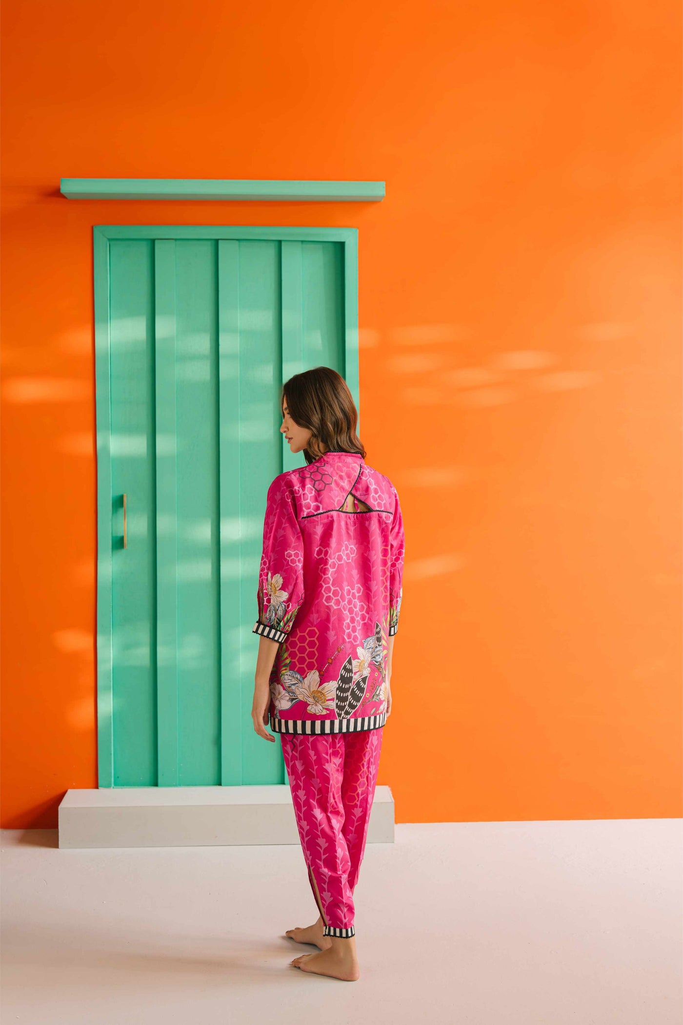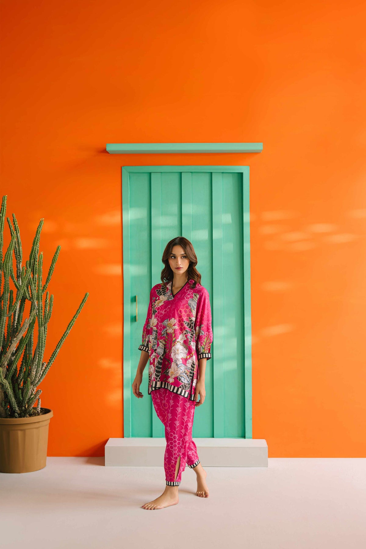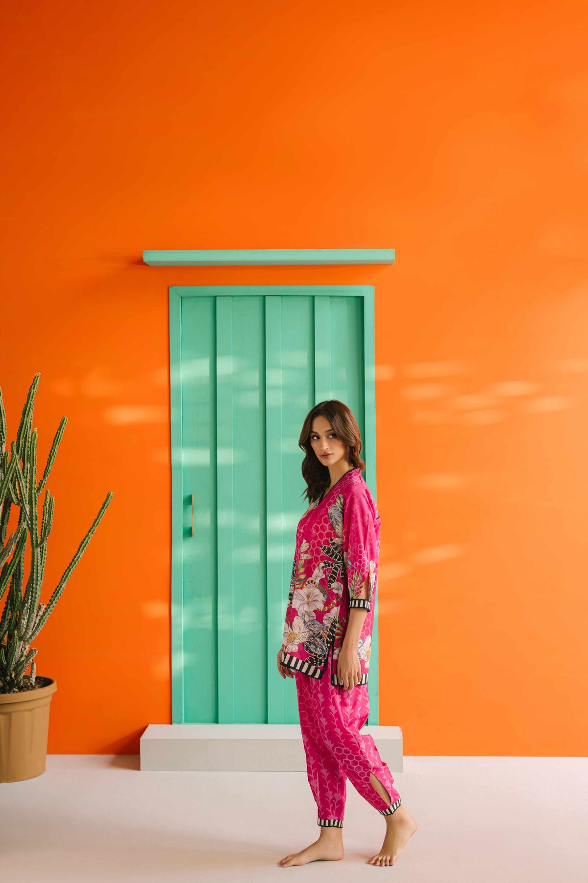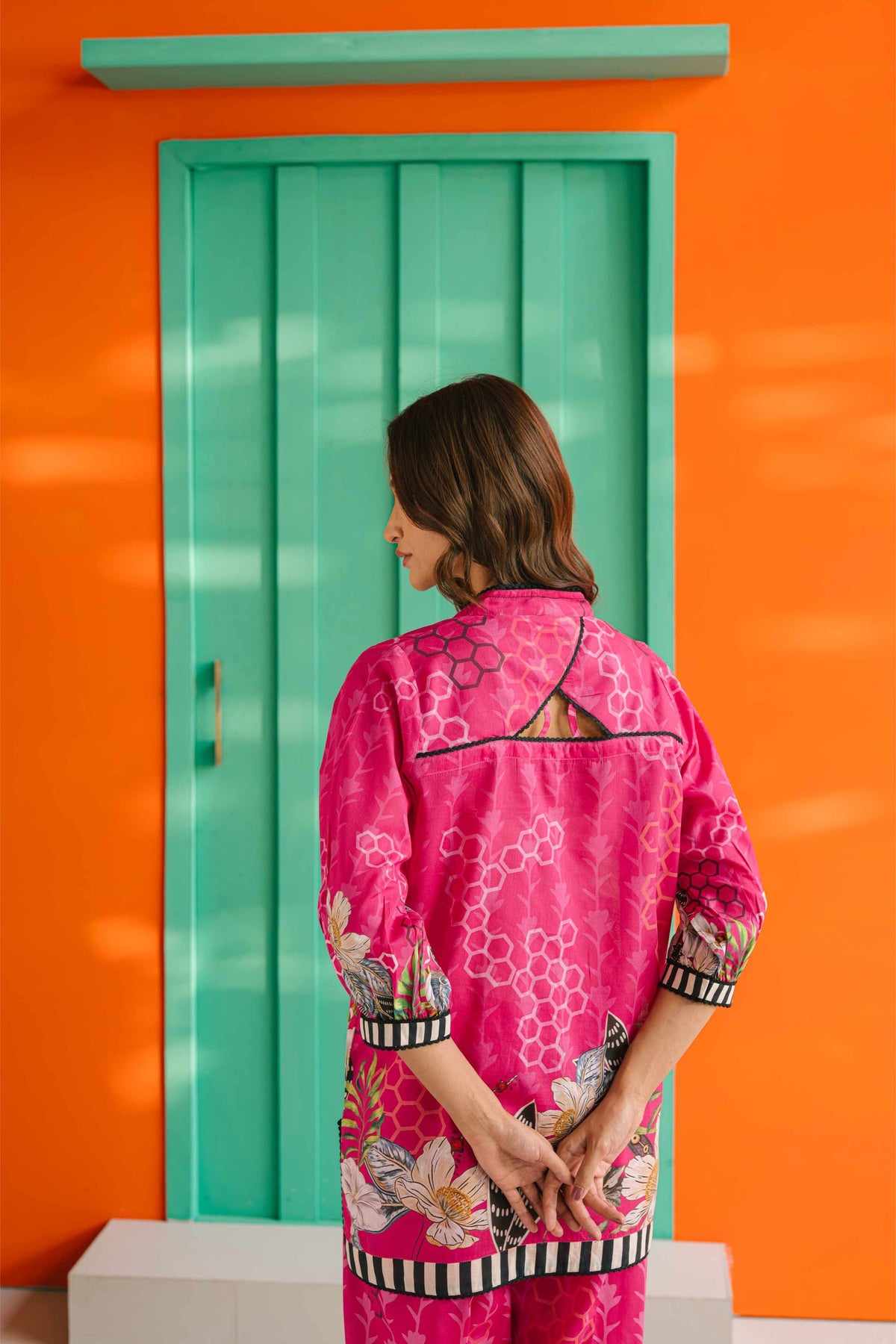 A vivid wild cherry ensemble bursting with bold florals and monochrome stripe detailing. The straight kurta features gathered sleeves for added flair. Paired with slim trousers featuring slit hems and matching accents.