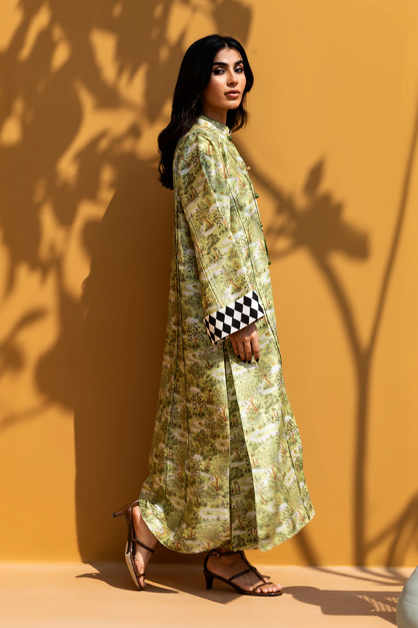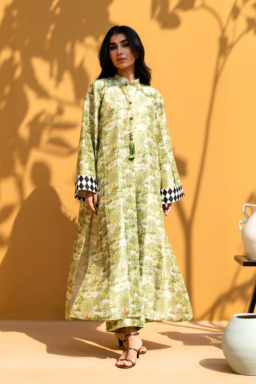 This relaxed silhouette in soft tea green rawsilk exudes a breezy, artistic charm. A sprawling scenic English garden landscape print flows across the flared cut, anchored by a mandarin collar finished with a playful hanging tassel. Wide sleeves are completed with striking ebony and ivory diamond checkered cuffs, introducing a bold geometric contrast to the fluid pattern. Paired with matching pure rawsilk culottes, the ensemble captures the allure of whimsical storytelling.