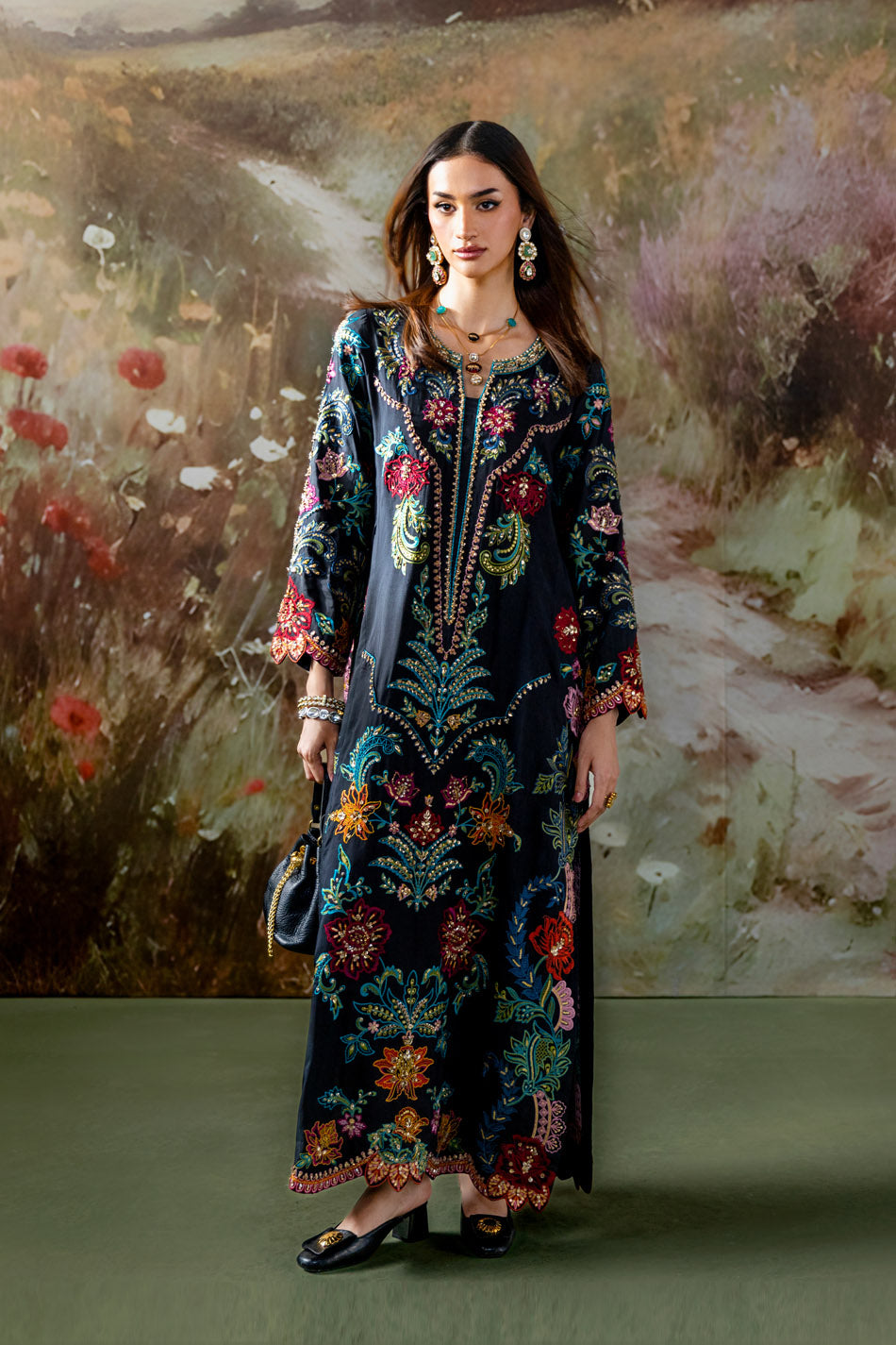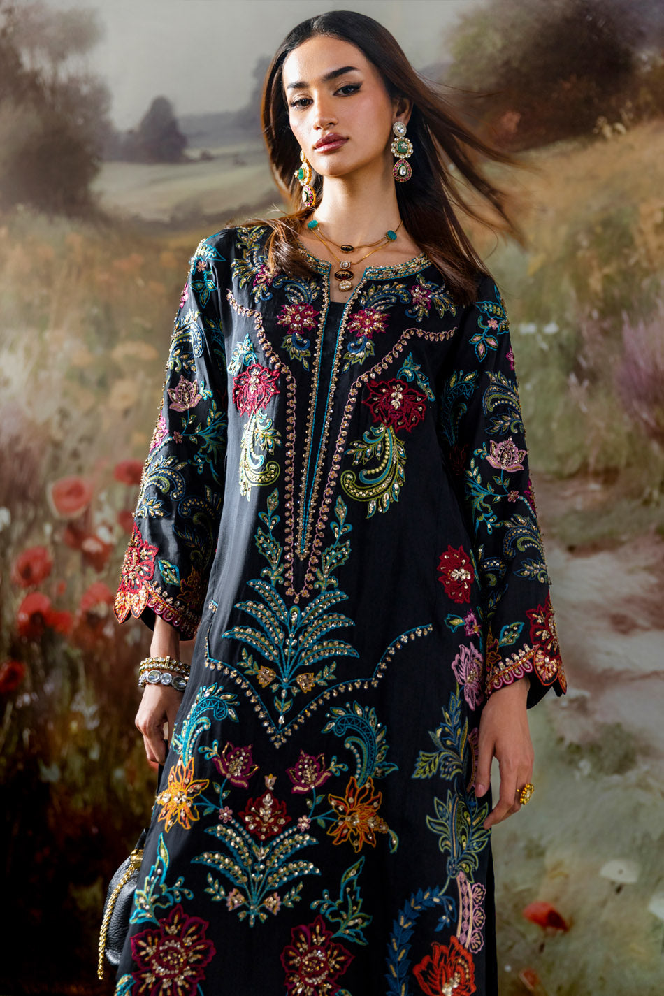 This luxury formal ensemble is crafted in a striking black base, brought to life with rich embroidery that cascades beautifully across the silhouette. The long, flowing cut offers a graceful and elongating effect. The front and sleeves are elevated with shimmering sequins embellishment, creating a radiant play of light with every movement. Intricate floral and vine-inspired embroidery in vibrant jewel tones adorns the shirt, complemented by a delicately detailed neckline. Elegant and artistic, this piece is a perfect fusion of opulence and sophistication.