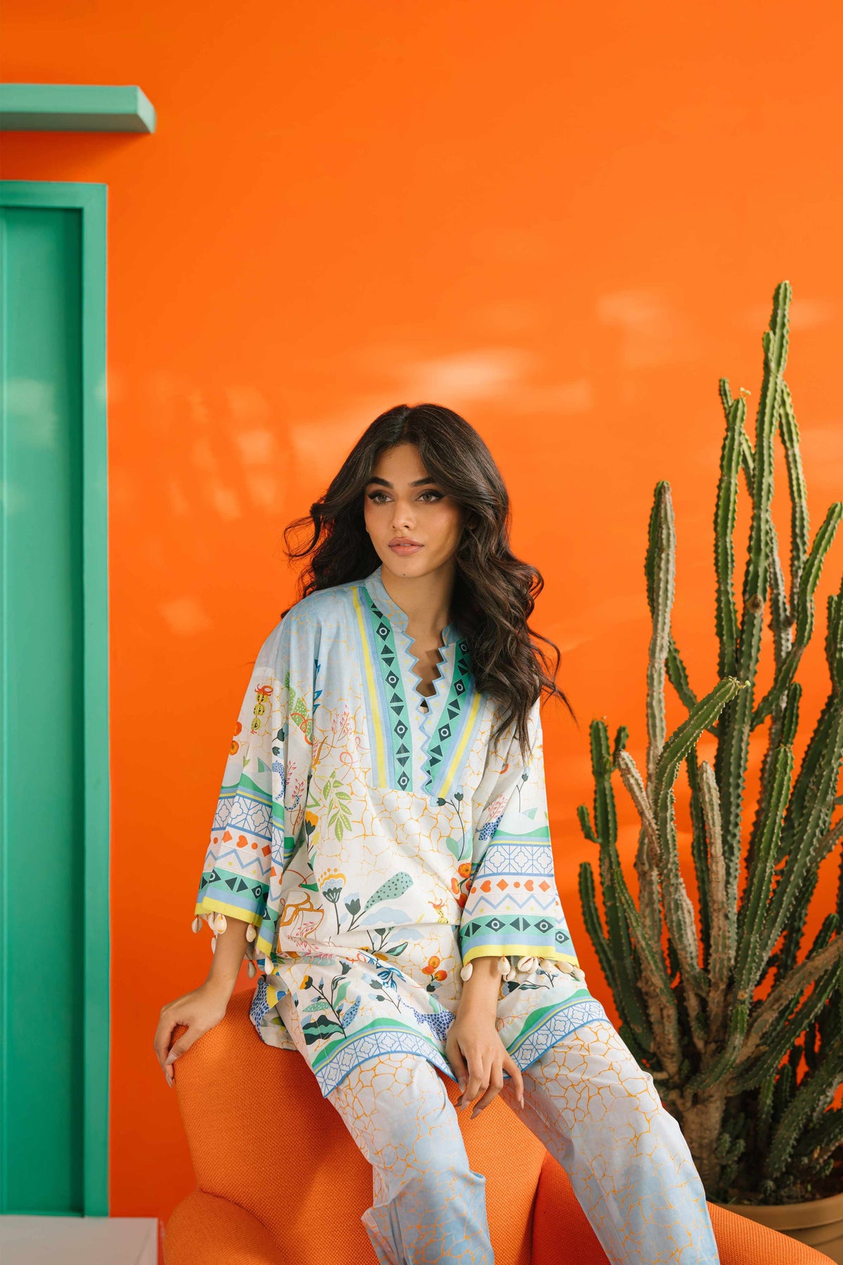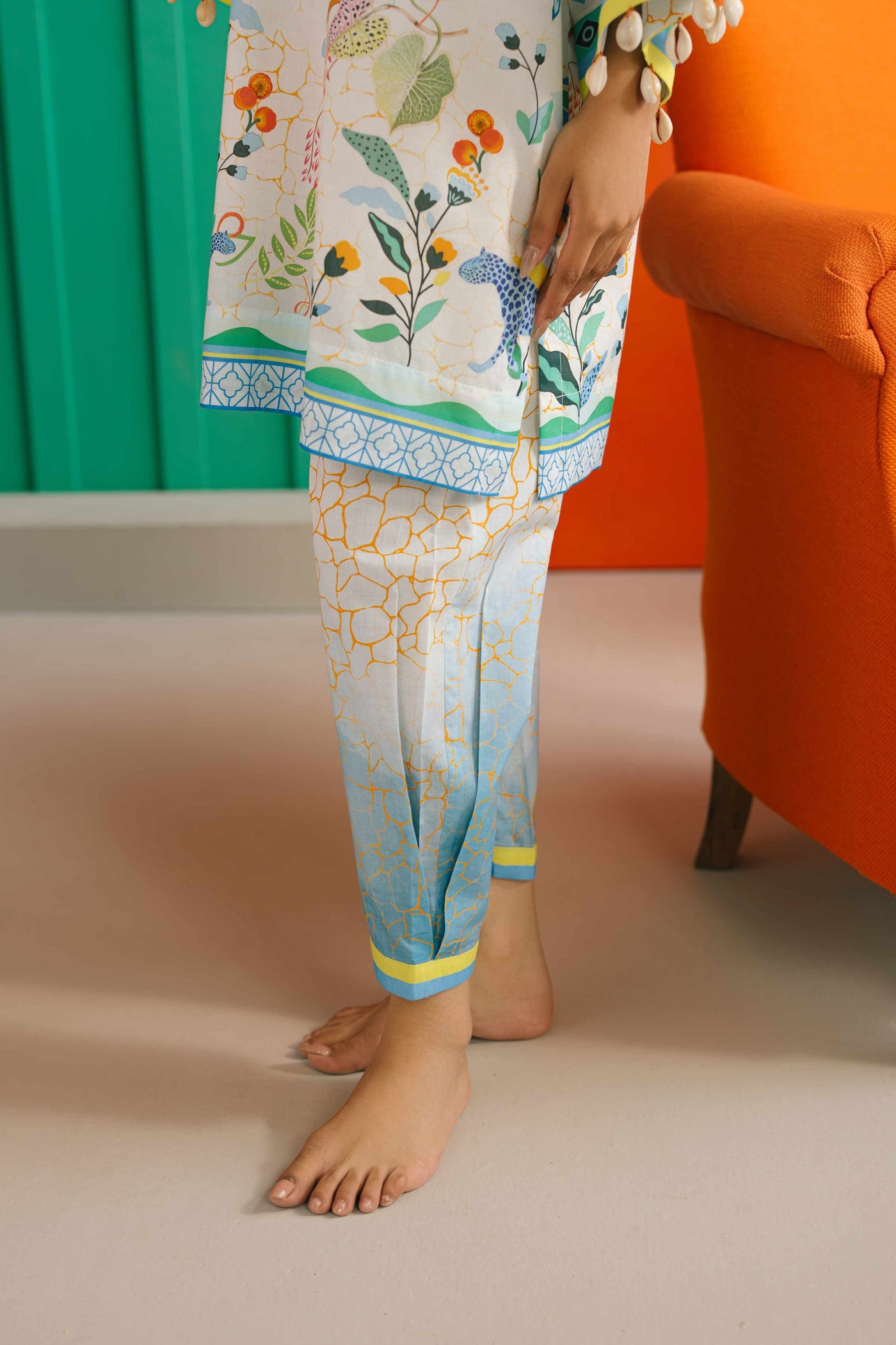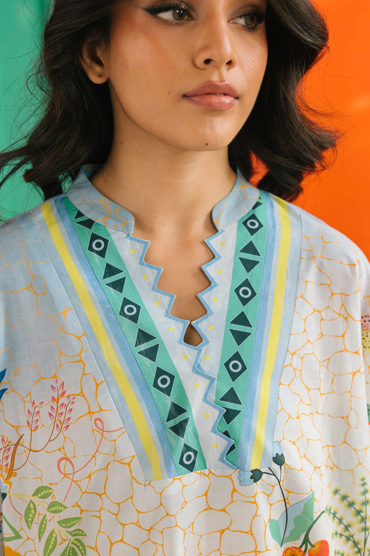 A breezy white base adorned with botanical prints in citrus and coral hues. The kurta features bright blue and green detailing with playful pom-poms along the sleeves. Paired with tapered pants featuring cracked tile motifs and a pop of lemon at the hem.