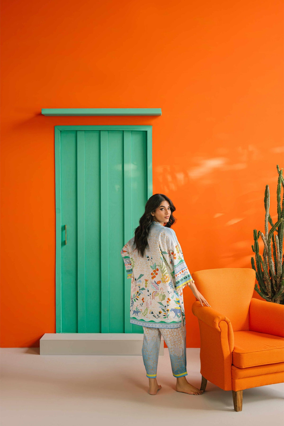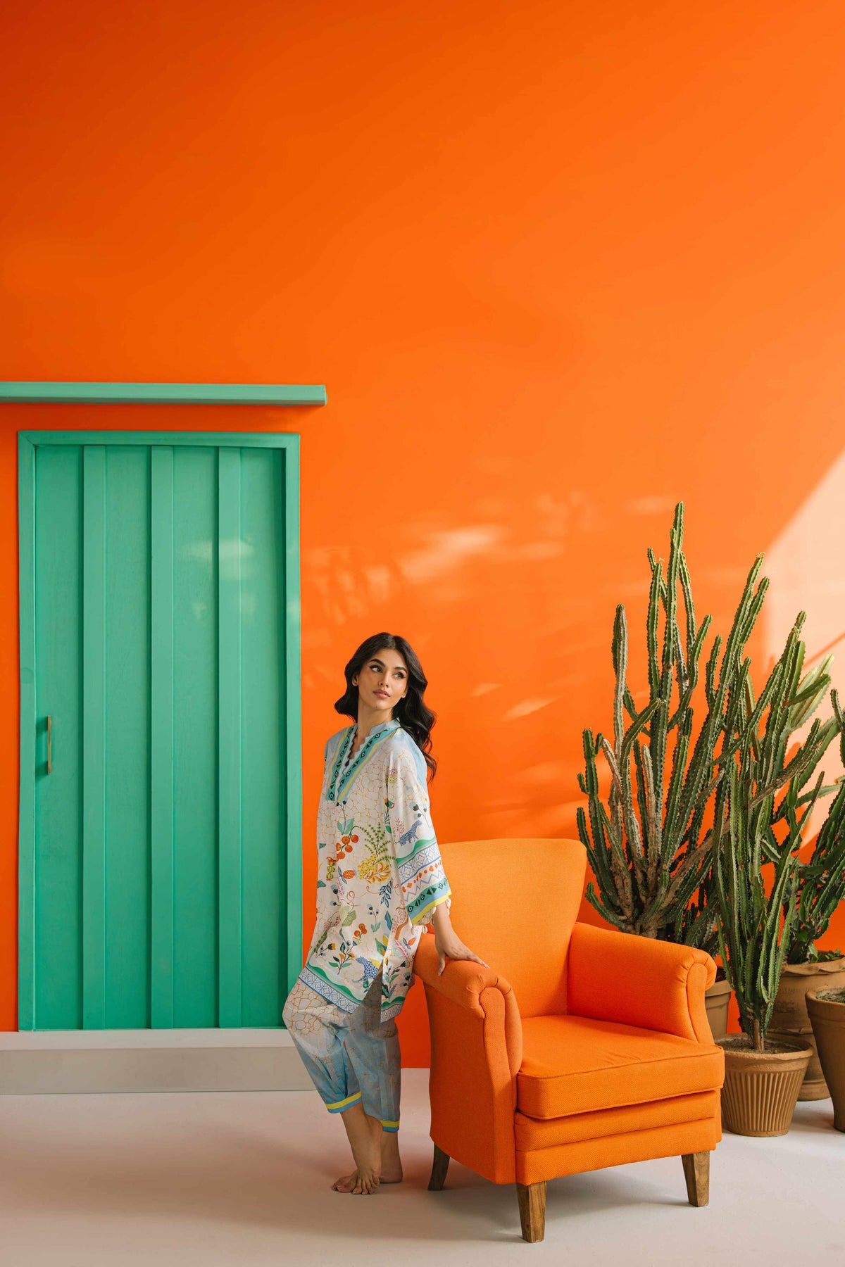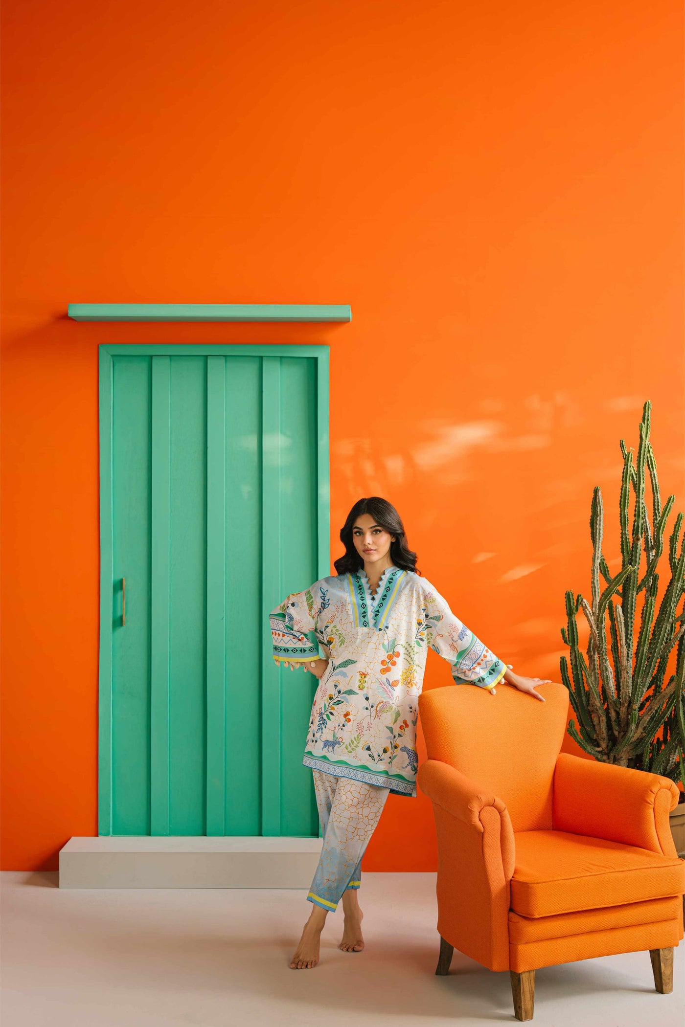 A breezy white base adorned with botanical prints in citrus and coral hues. The kurta features bright blue and green detailing with playful pom-poms along the sleeves. Paired with tapered pants featuring cracked tile motifs and a pop of lemon at the hem.