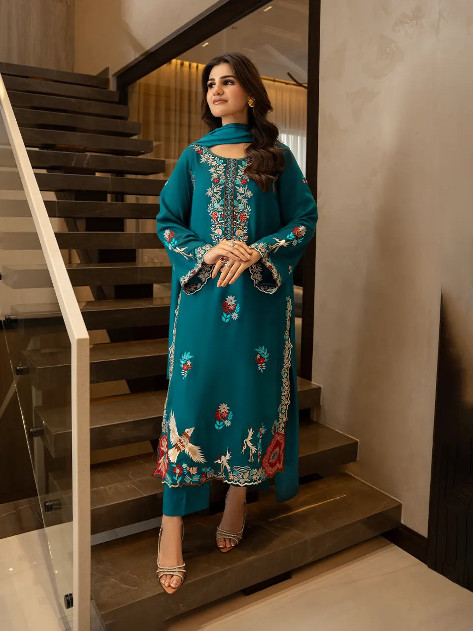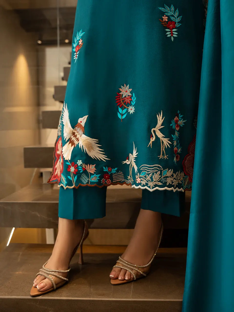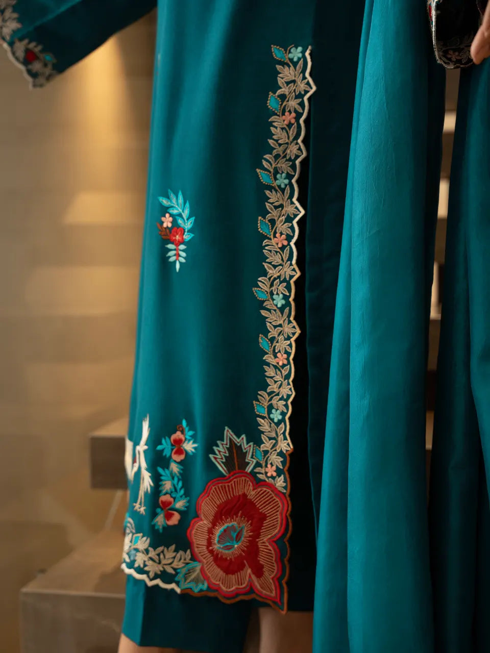 Fly into style with our stunning teal Karandi design, featuring vibrant embroidered birds in flight, accented with bold red appliqué and striking color blocks. The intricate stitchwork and contrasting hues create a captivating visual effect, perfect for adding a touch of whimsy to your Fall/Winter wardrobe. Ideal for nature lovers and fashion enthusiasts alike, this piece is sure to make a statement at any gathering.