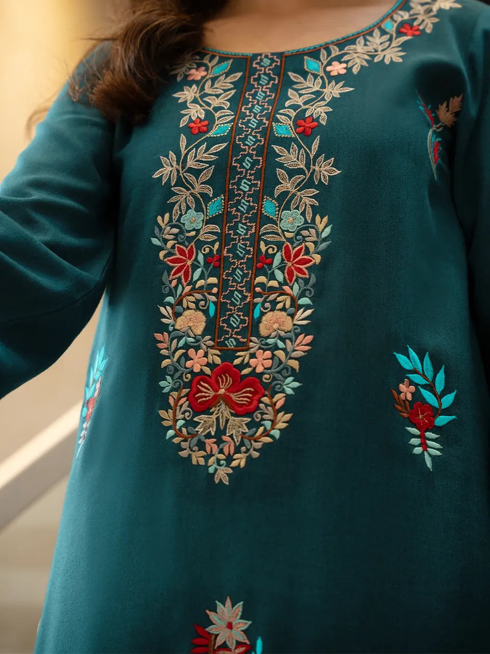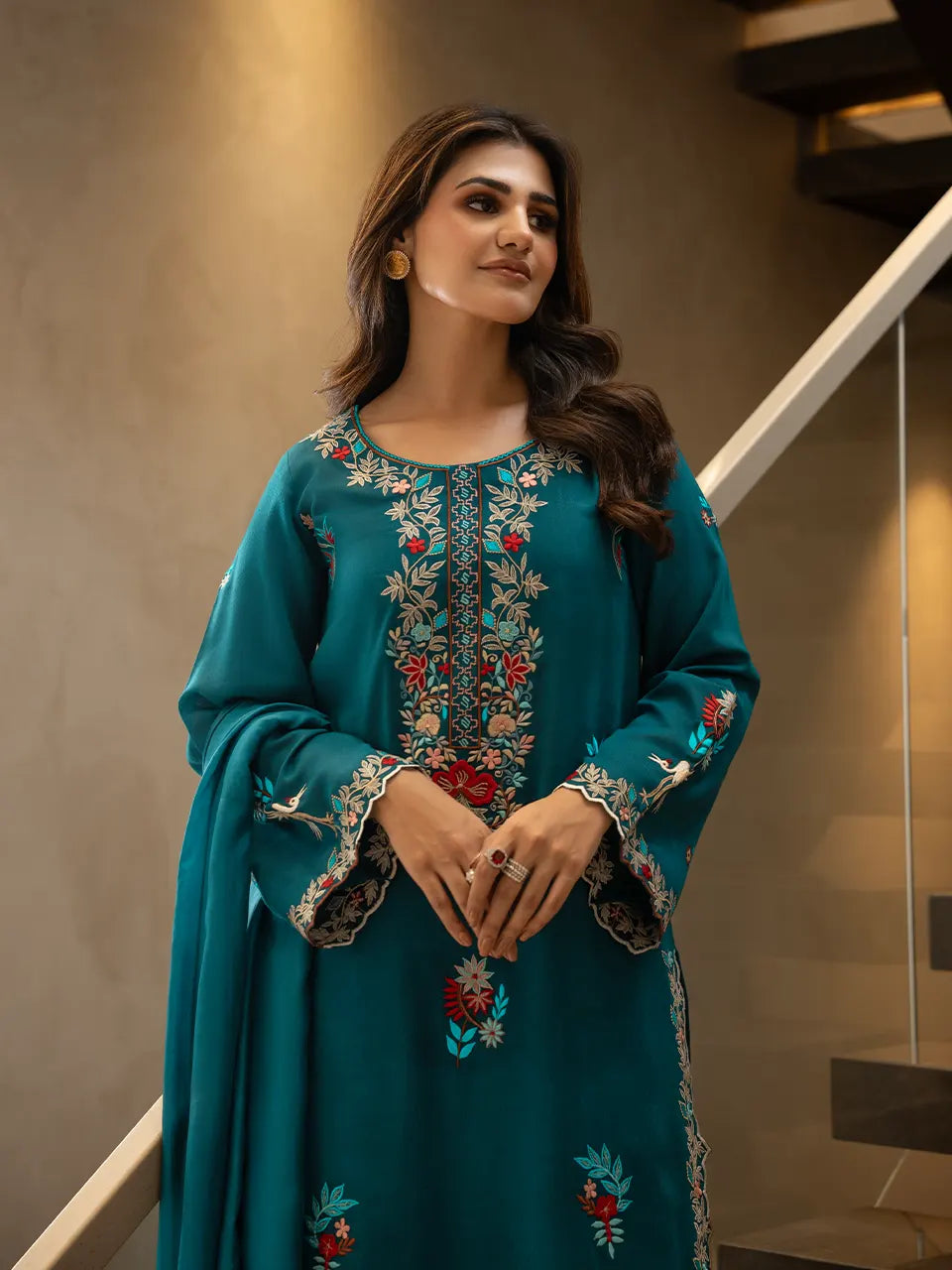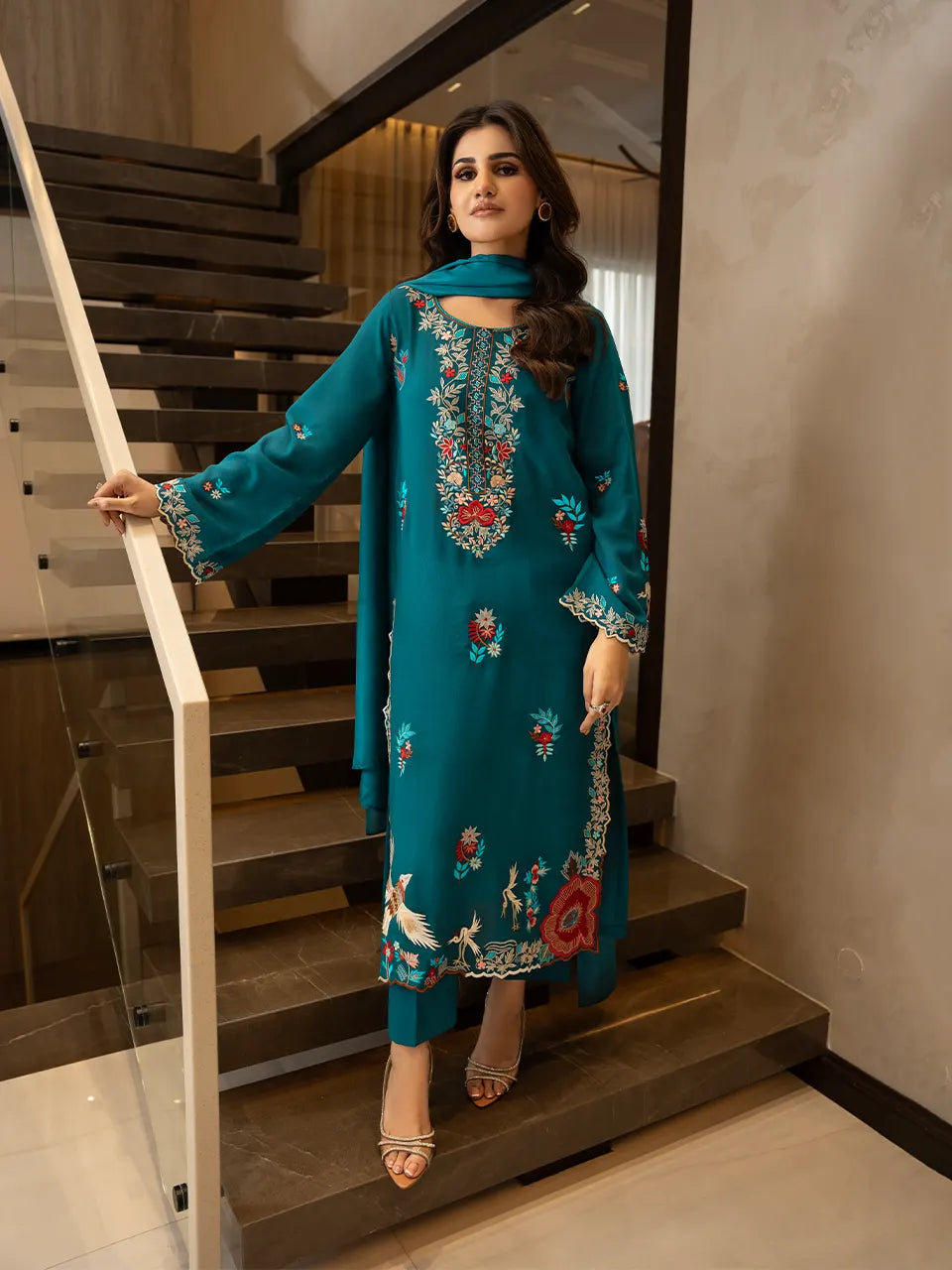 Fly into style with our stunning teal Karandi design, featuring vibrant embroidered birds in flight, accented with bold red appliqué and striking color blocks. The intricate stitchwork and contrasting hues create a captivating visual effect, perfect for adding a touch of whimsy to your Fall/Winter wardrobe. Ideal for nature lovers and fashion enthusiasts alike, this piece is sure to make a statement at any gathering.