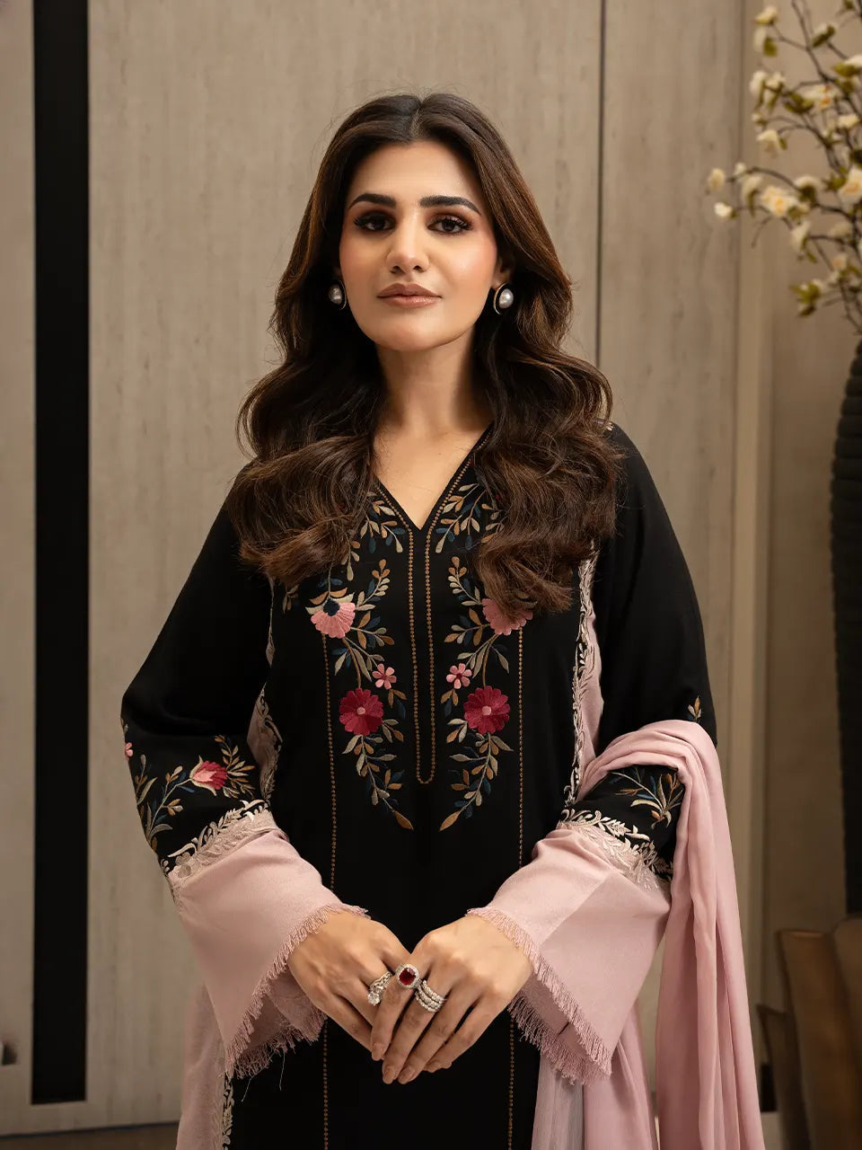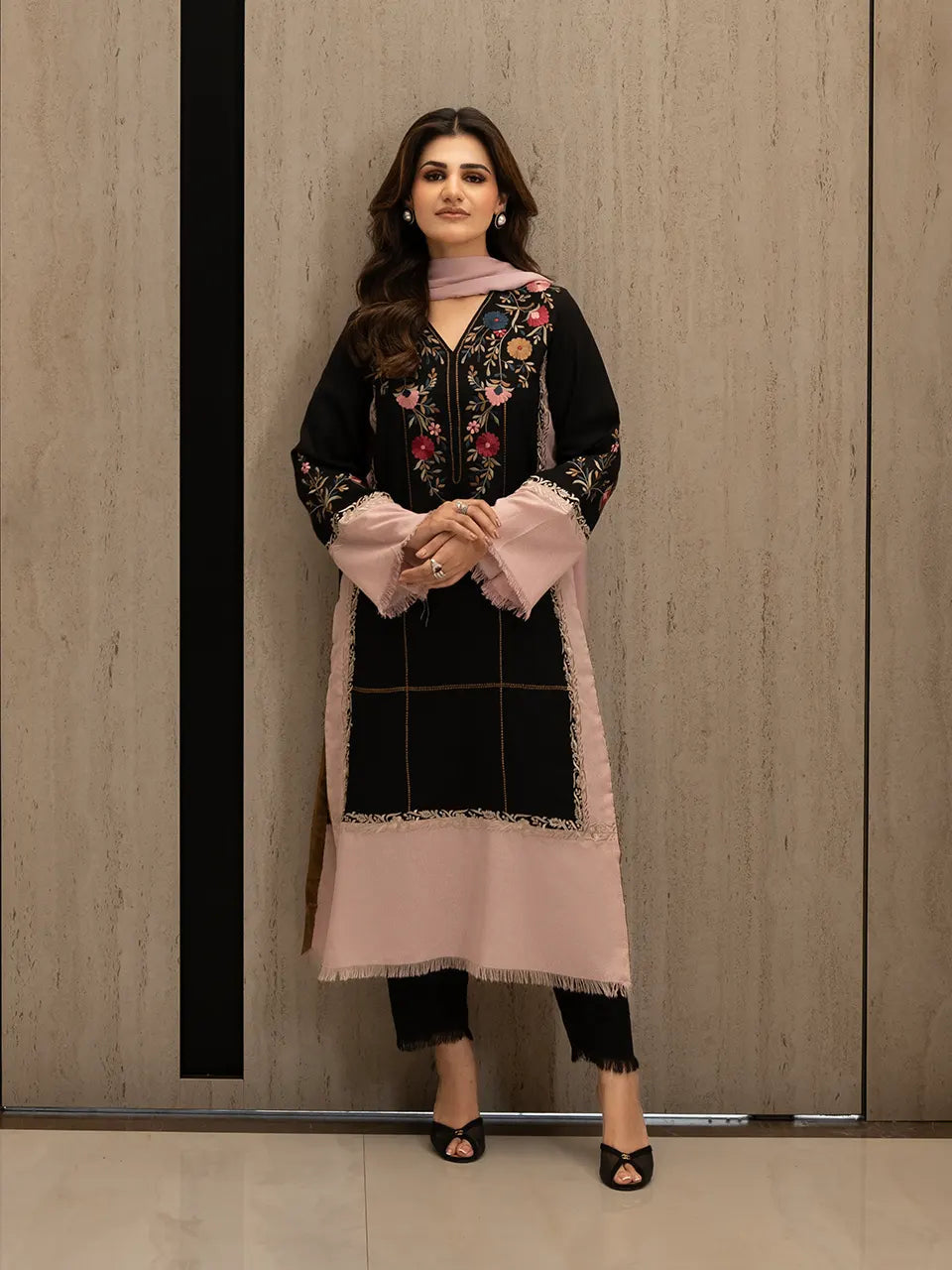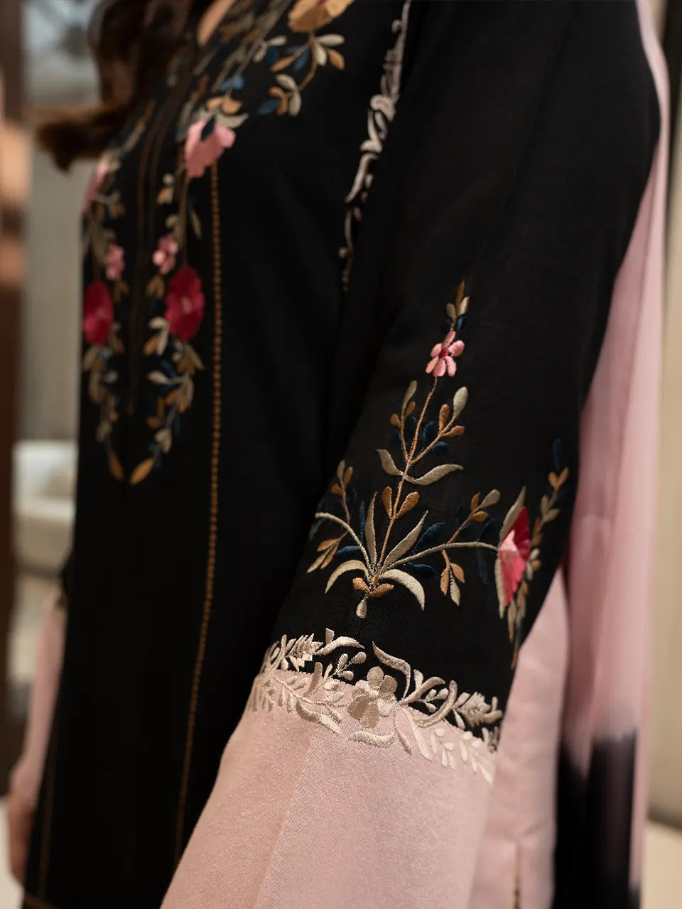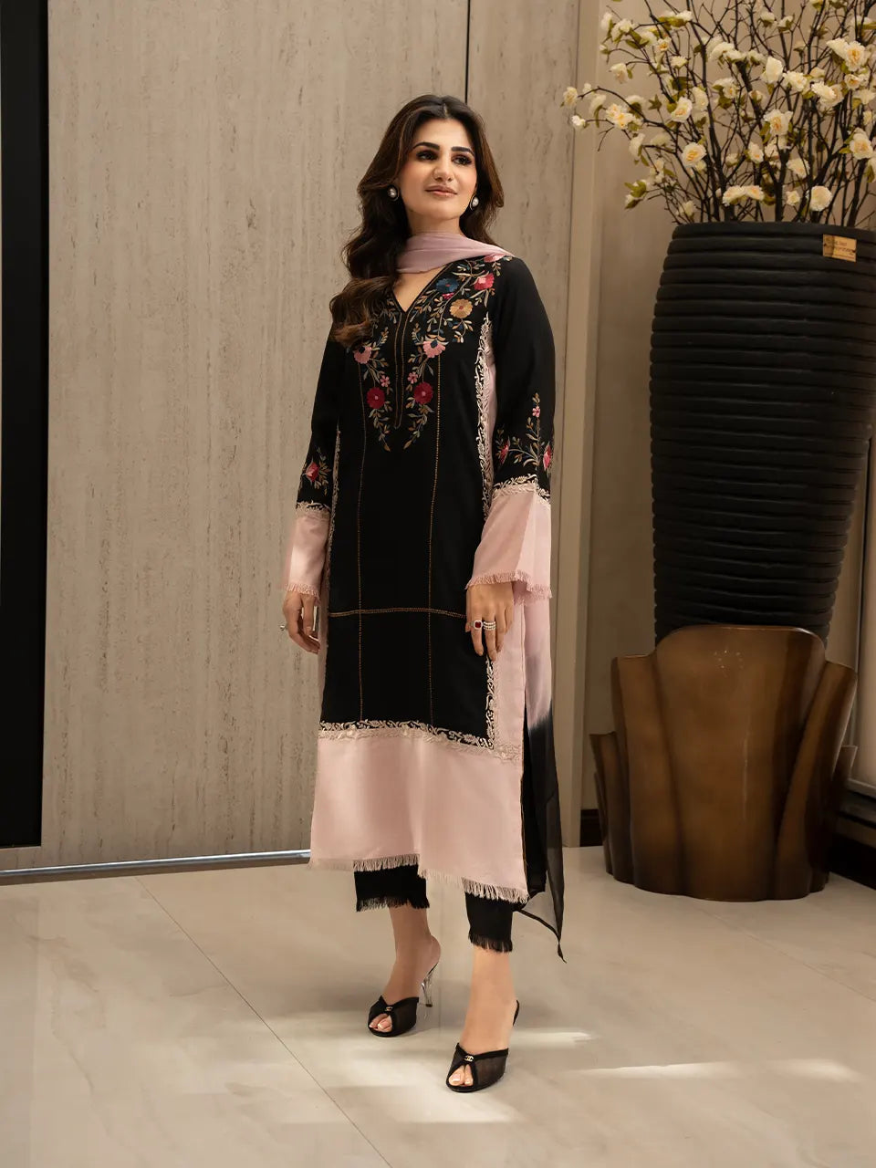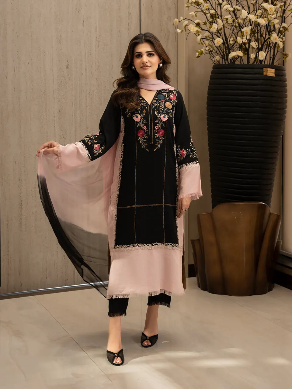 The design features beautifully detailed floral embroidery across the front and sleeves, adding depth, charm, and a feminine touch to the bold palette. Delicate dusty pink panels soften the look, creating a harmonious balance against the deep black base. The coordinated dupatta elevates the ensemble, completing a look that is both modern and timeless.