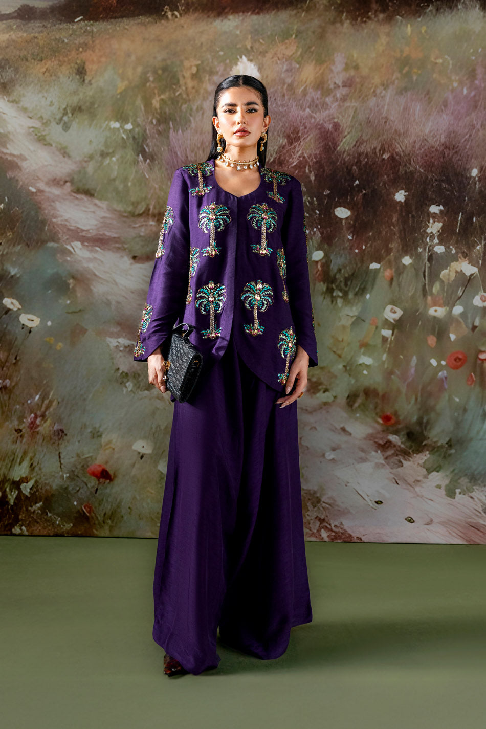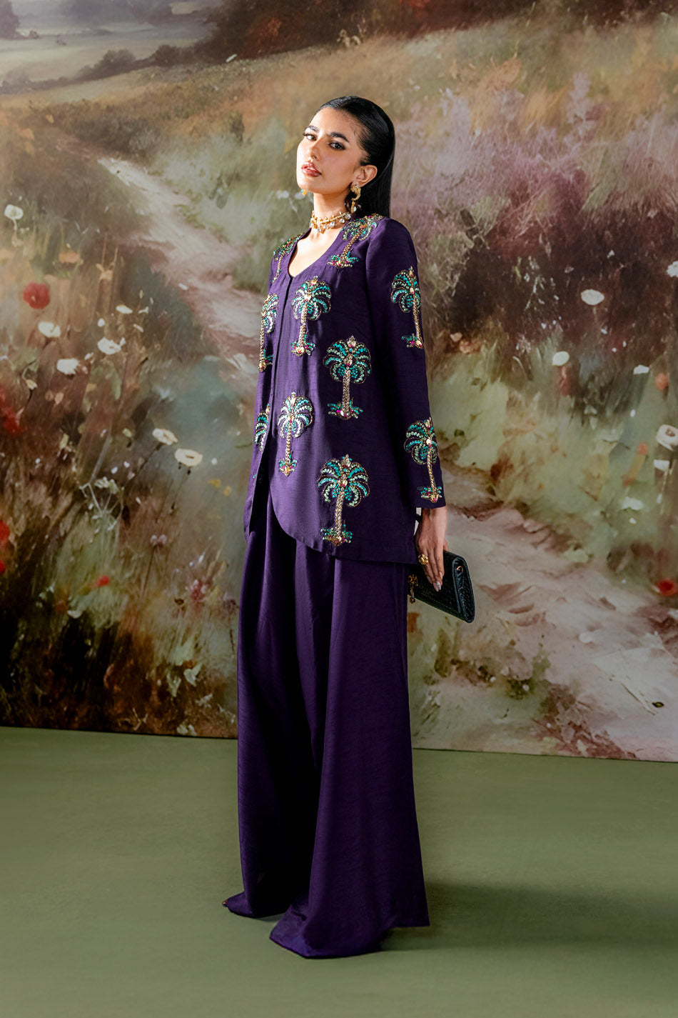 Radiating elegance, this deep purple luxury formal is adorned with exquisite multi-colored handcrafted motifs that beautifully illustrate stylized palm trees across the front, sleeves, and back. The sequins in varying shapes and tones add depth and create a rich visual to cherish. The jacket is cinched at the waist with a slight flare and forms a graceful silhouette. Paired with flared statement pants and luxurious detailing, this creation is designed to make a lasting impression at festive celebrations and special occasions.