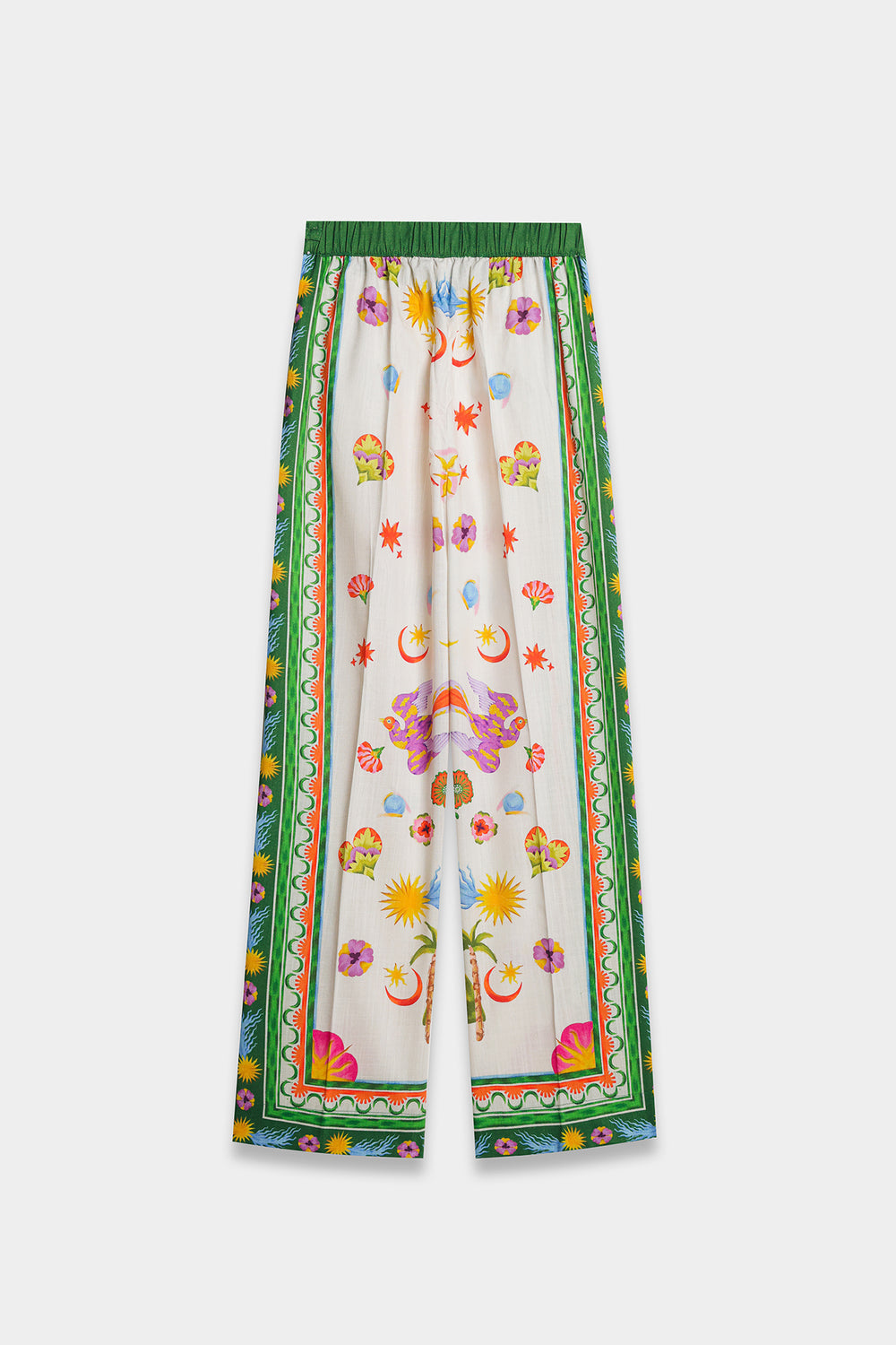 Elevate your style with this trendy outfit. This chic ensemble in off white boasts a contemporary button down top and matching pants. The elegant silhouette is enhanced by a vibrant abstract pattern printed in vibrant colors, perfect for any occasion this season. Expertly crafted, this suit exudes modern sophistication.