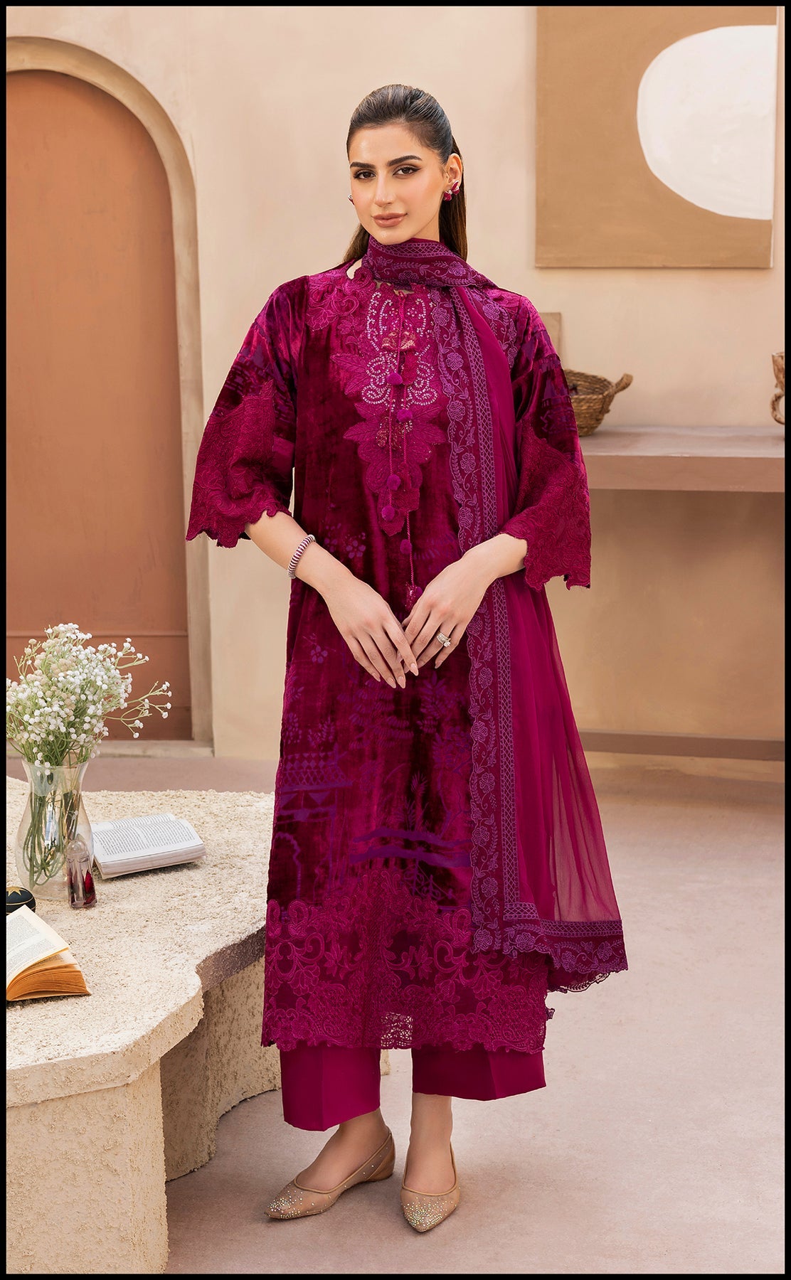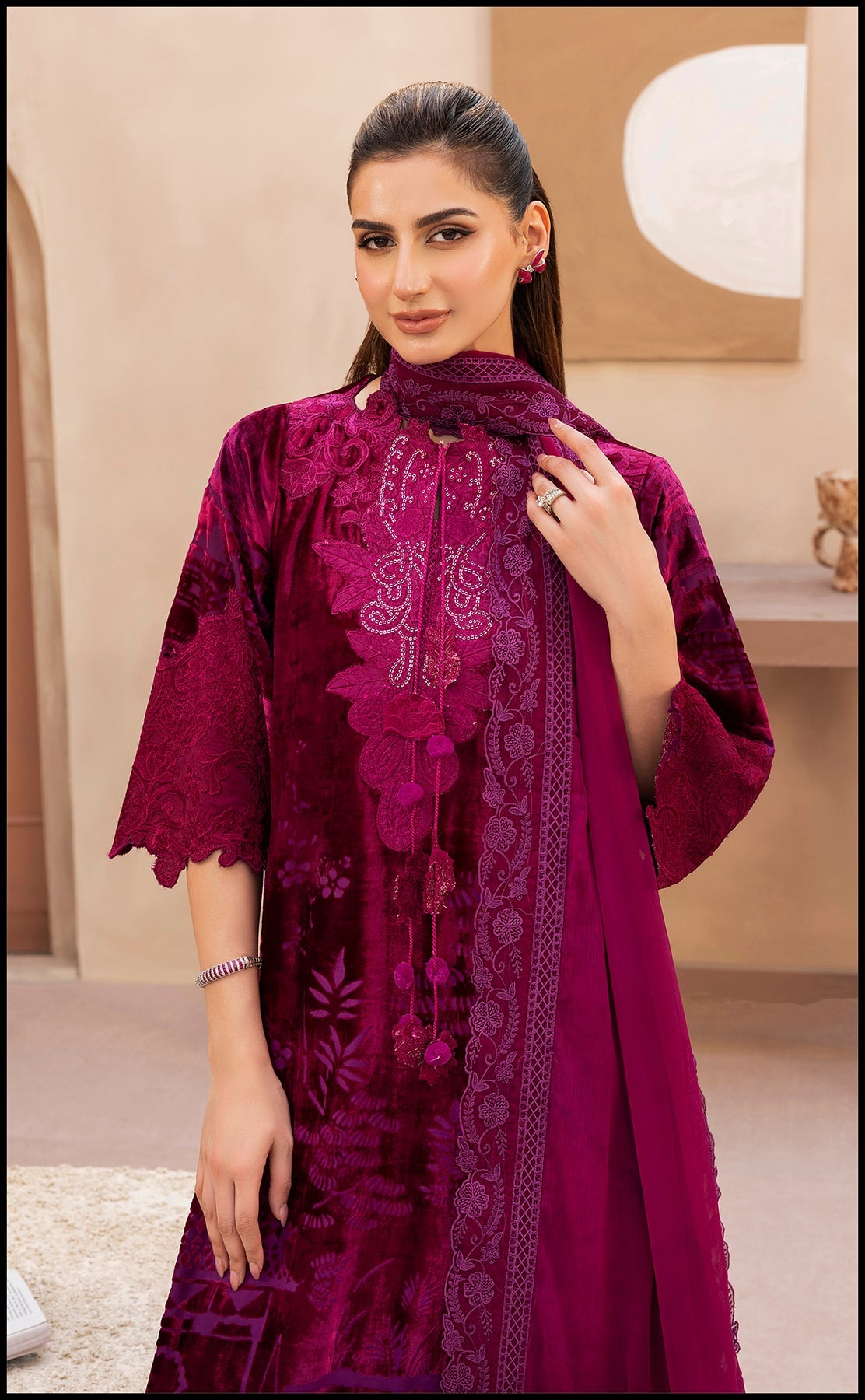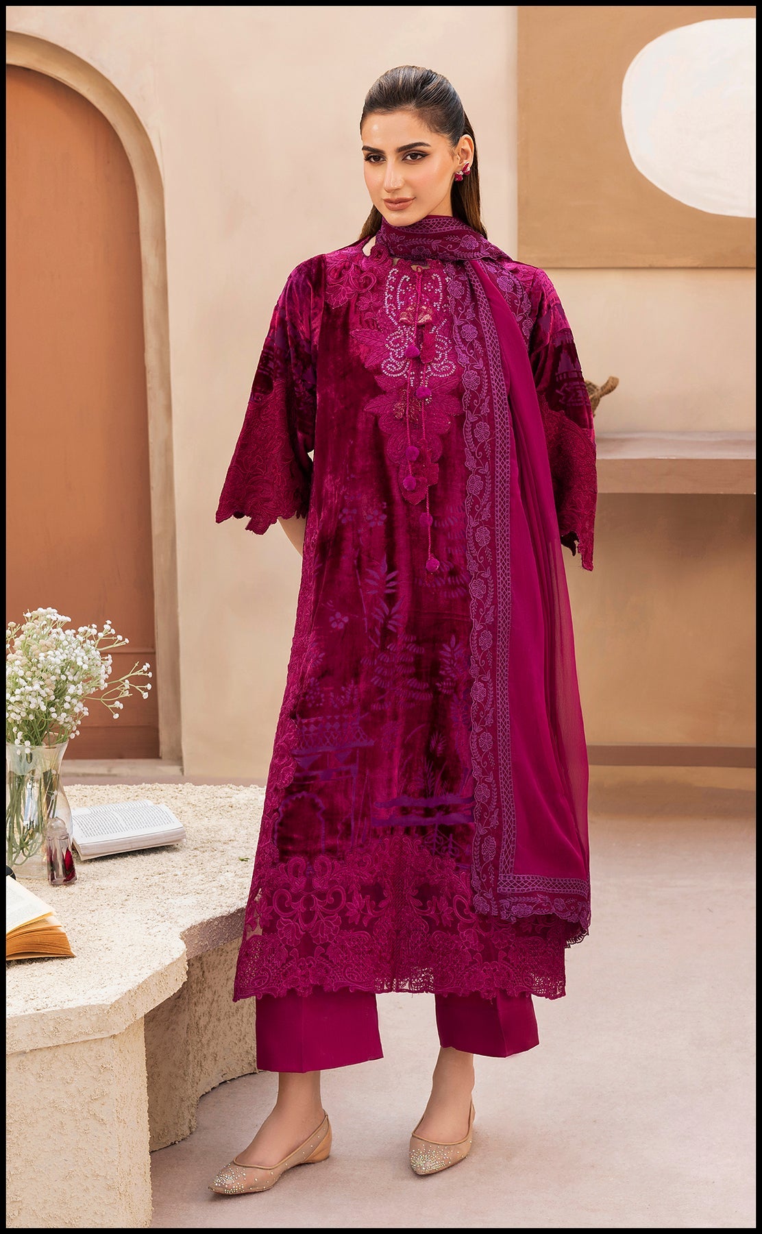 Cast an aura of timeless allure with Scarlet Spell — a three-piece velvet ensemble drenched in a rich scarlet hue. The shirt features intricate tonal embroidery gracing the neckline, sleeves, and hem, while the beautifully crafted dupatta is adorned with ornate borders.