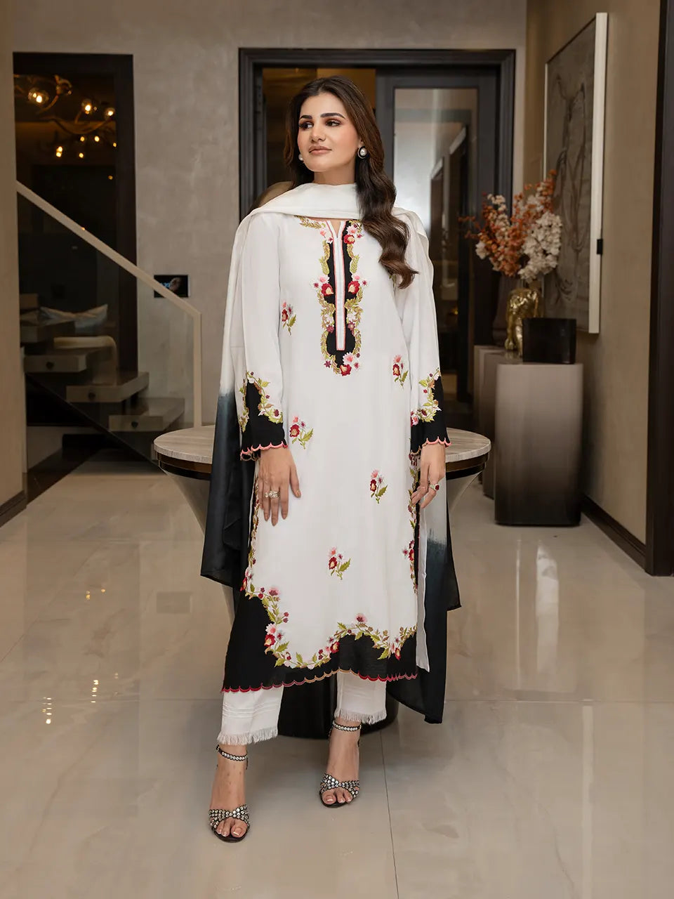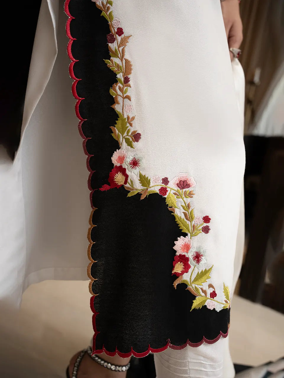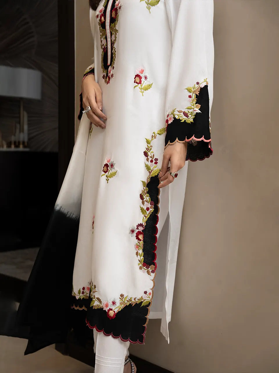 Elevate your style with our In-house Premium Karandi fabric, featuring a striking black and white color-blocked dress with a bold, modern twist. Delicate floral embroidery with pink flowers and green leaves adds a touch of elegance, creating a sophisticated look that's perfect for making a statement. The classic OG black and white combination is reimagined with a fresh spin, making this piece a timeless addition to any wardrobe.