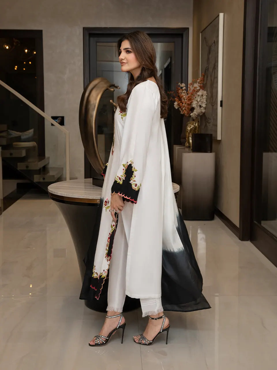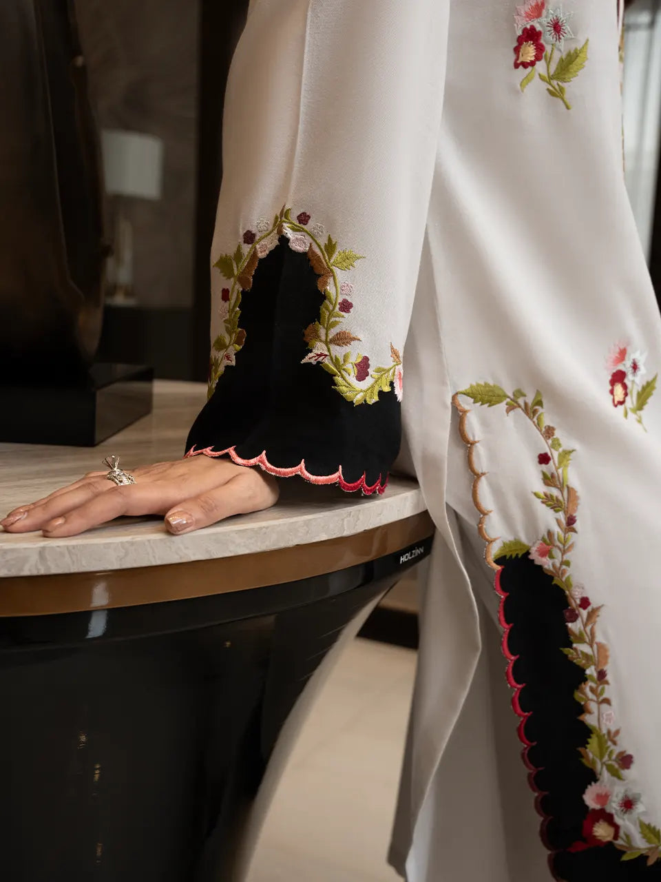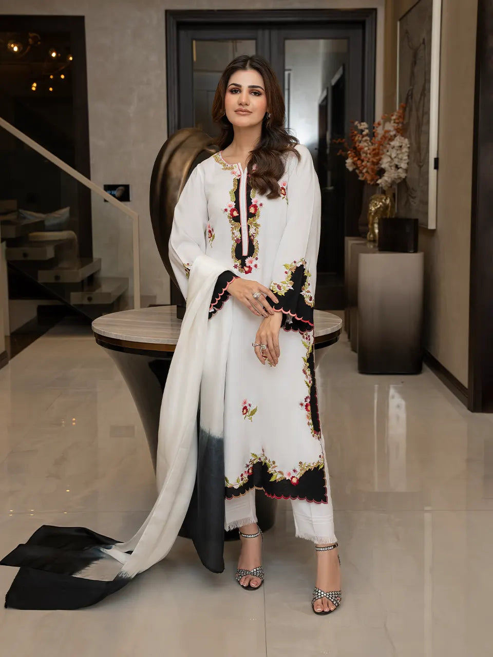 Elevate your style with our In-house Premium Karandi fabric, featuring a striking black and white color-blocked dress with a bold, modern twist. Delicate floral embroidery with pink flowers and green leaves adds a touch of elegance, creating a sophisticated look that's perfect for making a statement. The classic OG black and white combination is reimagined with a fresh spin, making this piece a timeless addition to any wardrobe.